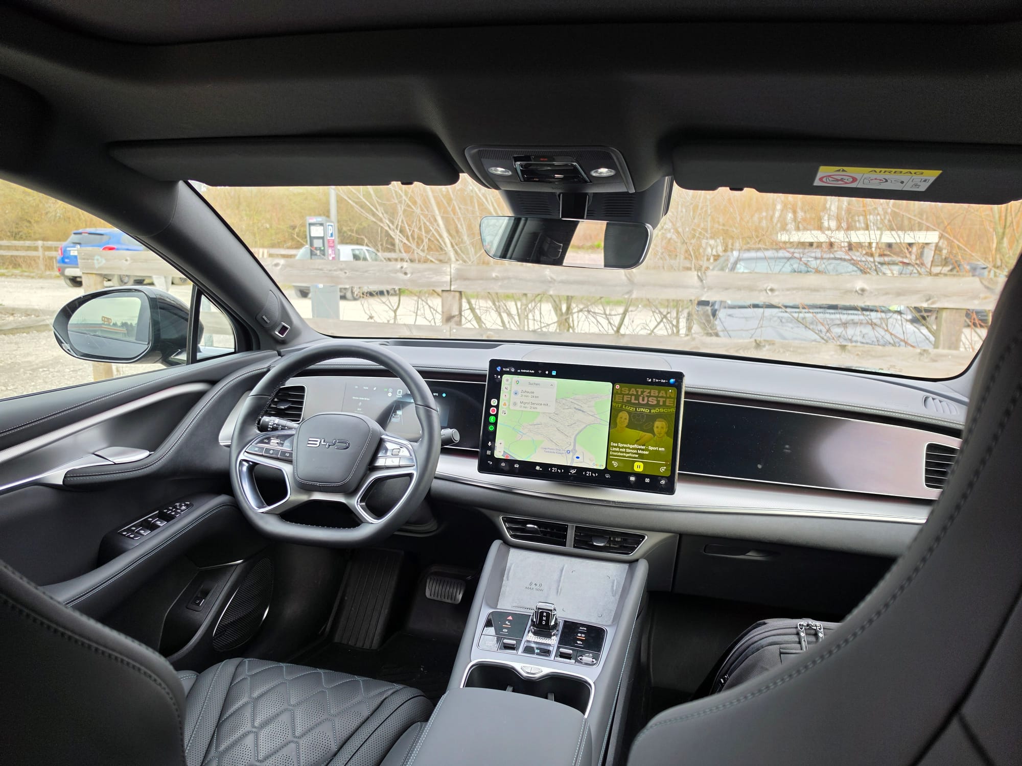 Beim Innenraum halten sich die Chinesen dezent zurück. Und das ist auch gut so. Es erwartet einen eine Mischung aus moderner Technik und wohnlichem Komfort. Das resultiert zumindest im Cockpit in einem insgesamt luftigen Raumgefühl. Dafür sorgen auch die vielen Ablageflächen im Fahrzeug. Die Materialwahl der Variante „Excellence” kann dabei vollends überzeugen. BYD setzt dabei vorwiegend auf Nappaleder, das sich weich und angenehm anfühlt, und sauber verarbeiteten Oberflächen.