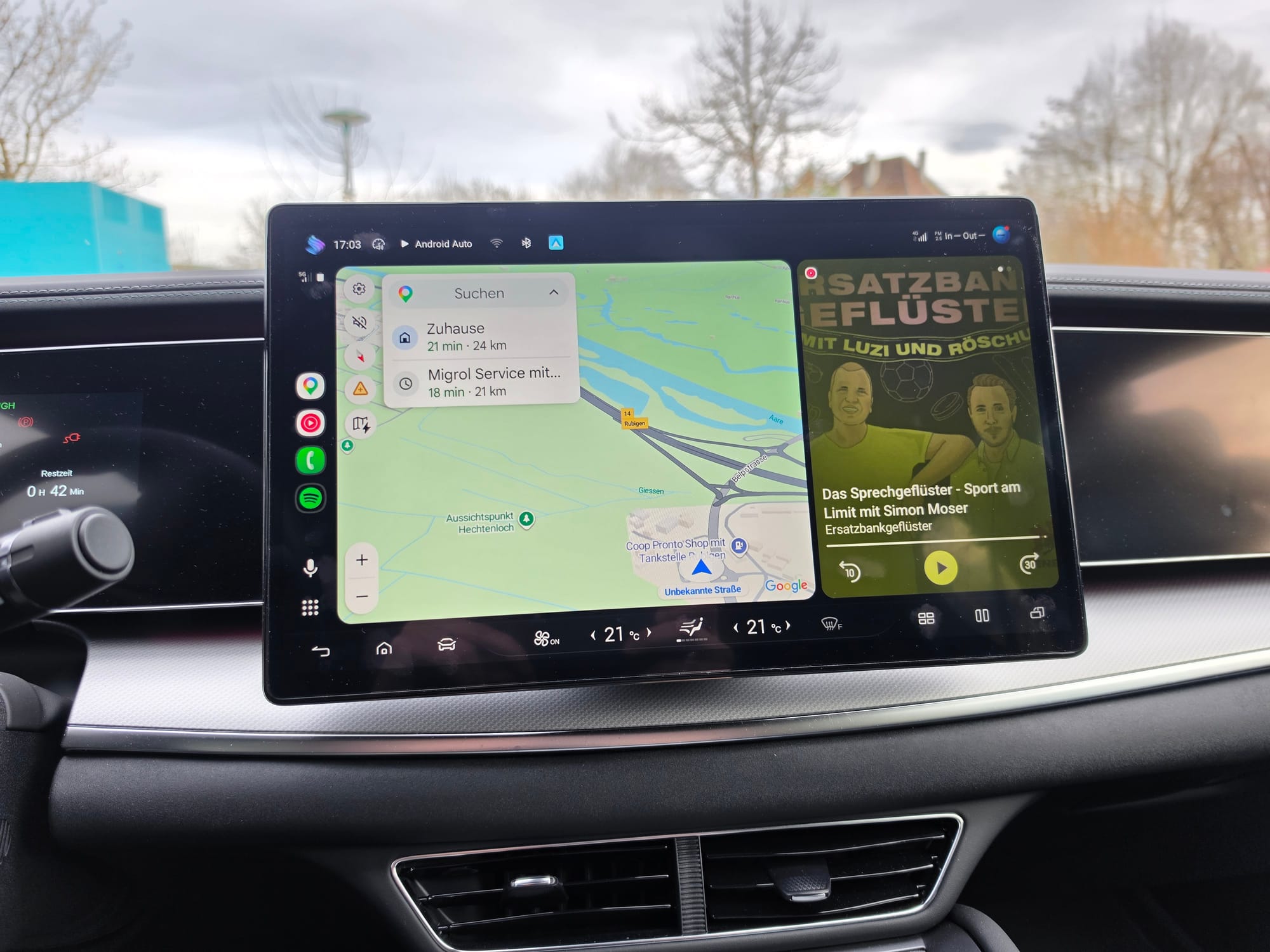Das Infotainment reagiert insgesamt schnell auf Eingaben und bietet alle Funktionen, die man sich wünscht. Eine gewisse Eingewöhnungszeit muss indes auch dafür eingeplant werden. Das integrierte Navi funktioniert zuverlässig und schlägt auf Wunsch auch eine Ladeplanung mit entsprechenden Ladestopps vor. Wer möchte kann Android Auto und Apple CarPlay kabellos verwenden. Das hat im Alltag gut funktioniert. Sie funktionieren allerdings nur bei horizontal eingestelltem Display.