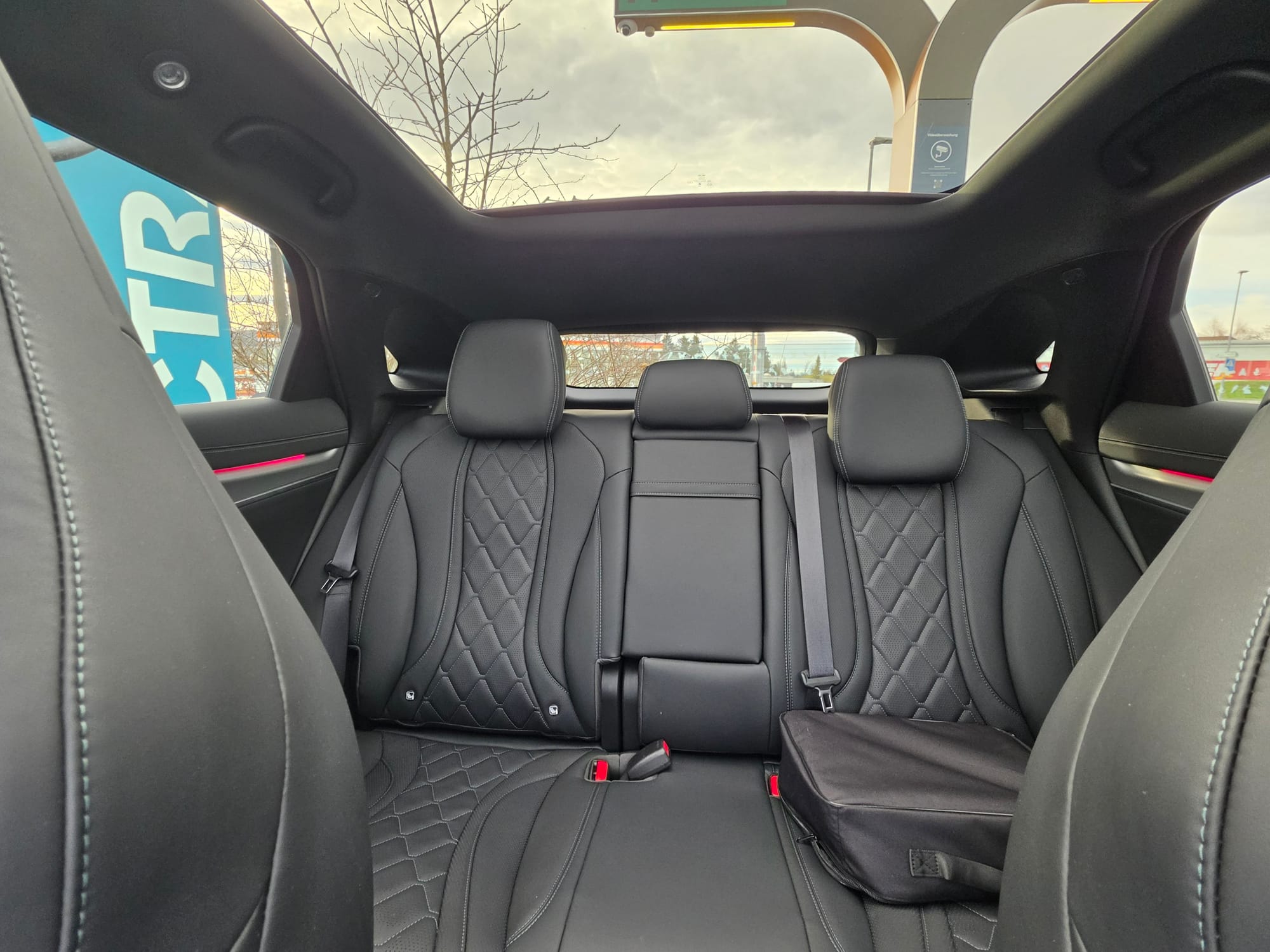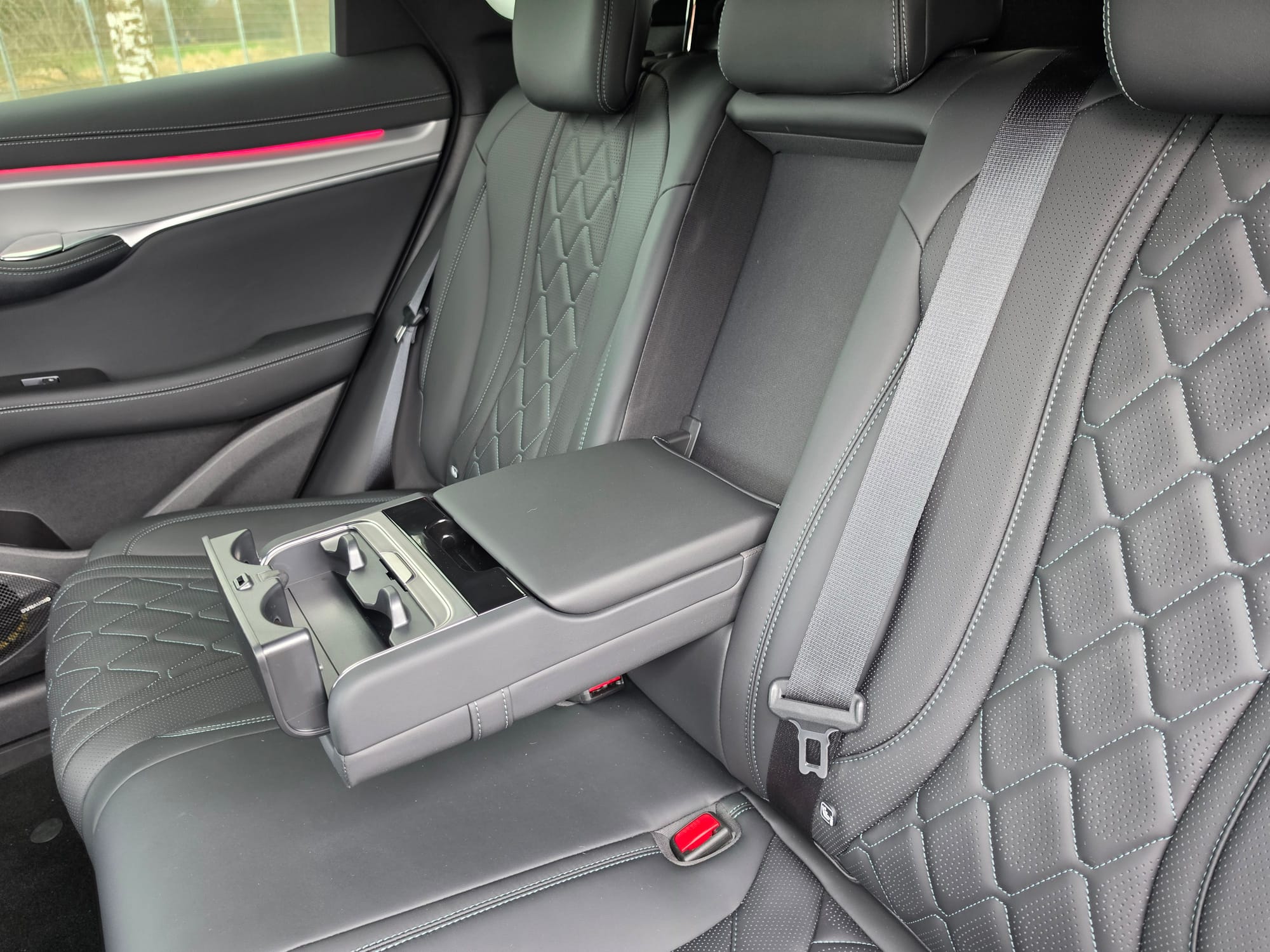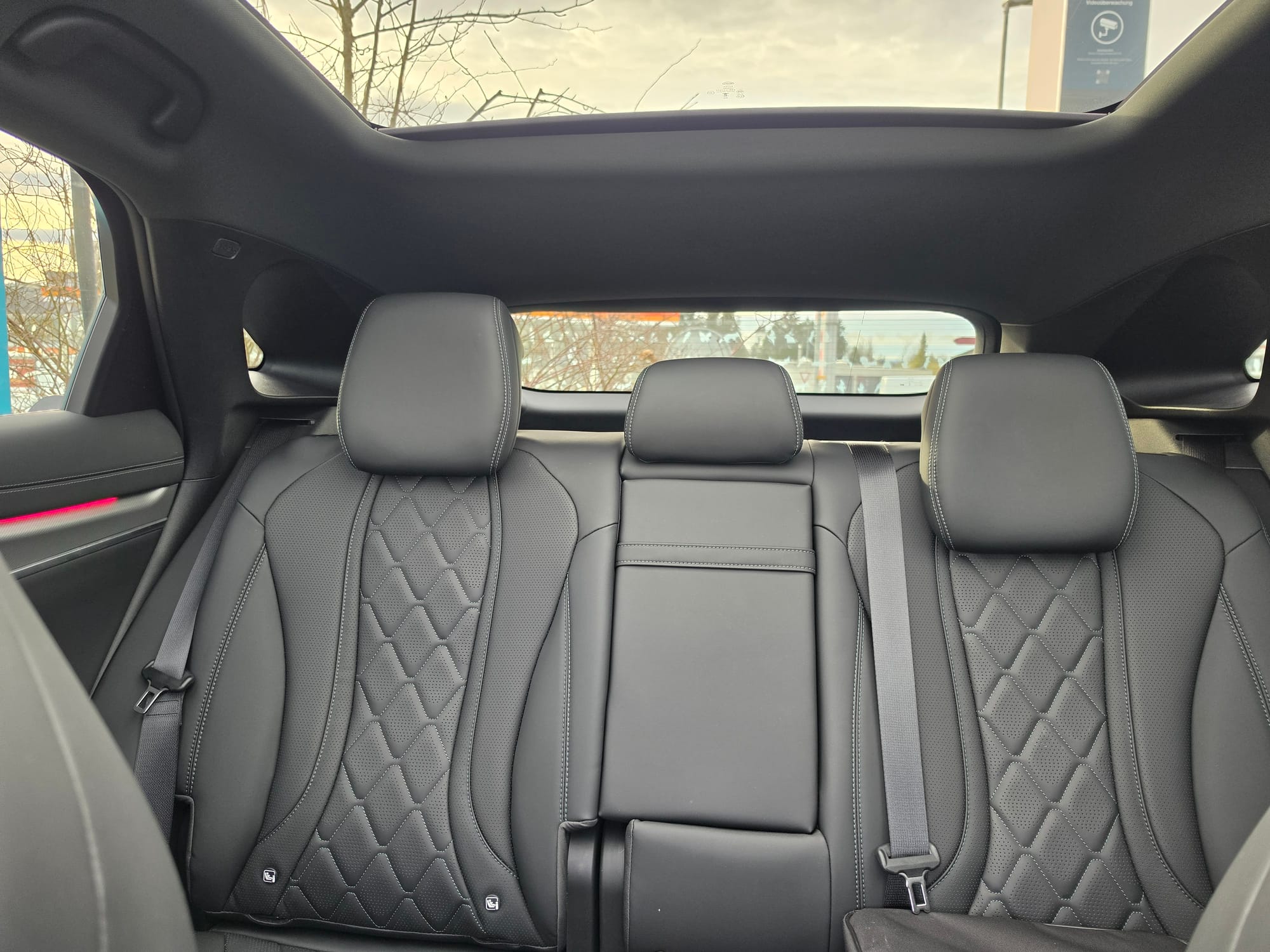 Etwas knapper wird es auf den ebenfalls bequemen Sitzen der Rückbank. Gerade grössere Menschen dürften hier schnell an die Grenzen des Fahrzeugs stossen – wortwörtlich. Mit meinen knapp 1,90 Metern hatte ich in Bezug auf die Kopffreiheit jedenfalls nicht den gewünschten Komfort. Oder anders formuliert: Bei einer gröberen Bodenwelle würde ich zwangsläufig mit dem Dachhimmel Bekanntschaft machen. Da bringt mir auch die grosszügige Beinfreiheit nicht besondenders viel. Apropos Dachhimmel: Der Sealion 7 verfügt über ein schönes und grosses Panorama-Glasdach samt elektronisch verstellbaren Sonnenrollo, das sich bis zu den hinteren Plätzen erstreckt. Der Mittelplatz lässt sich zudem zu einer Armlehne mit Becherhalter umfunktionieren.