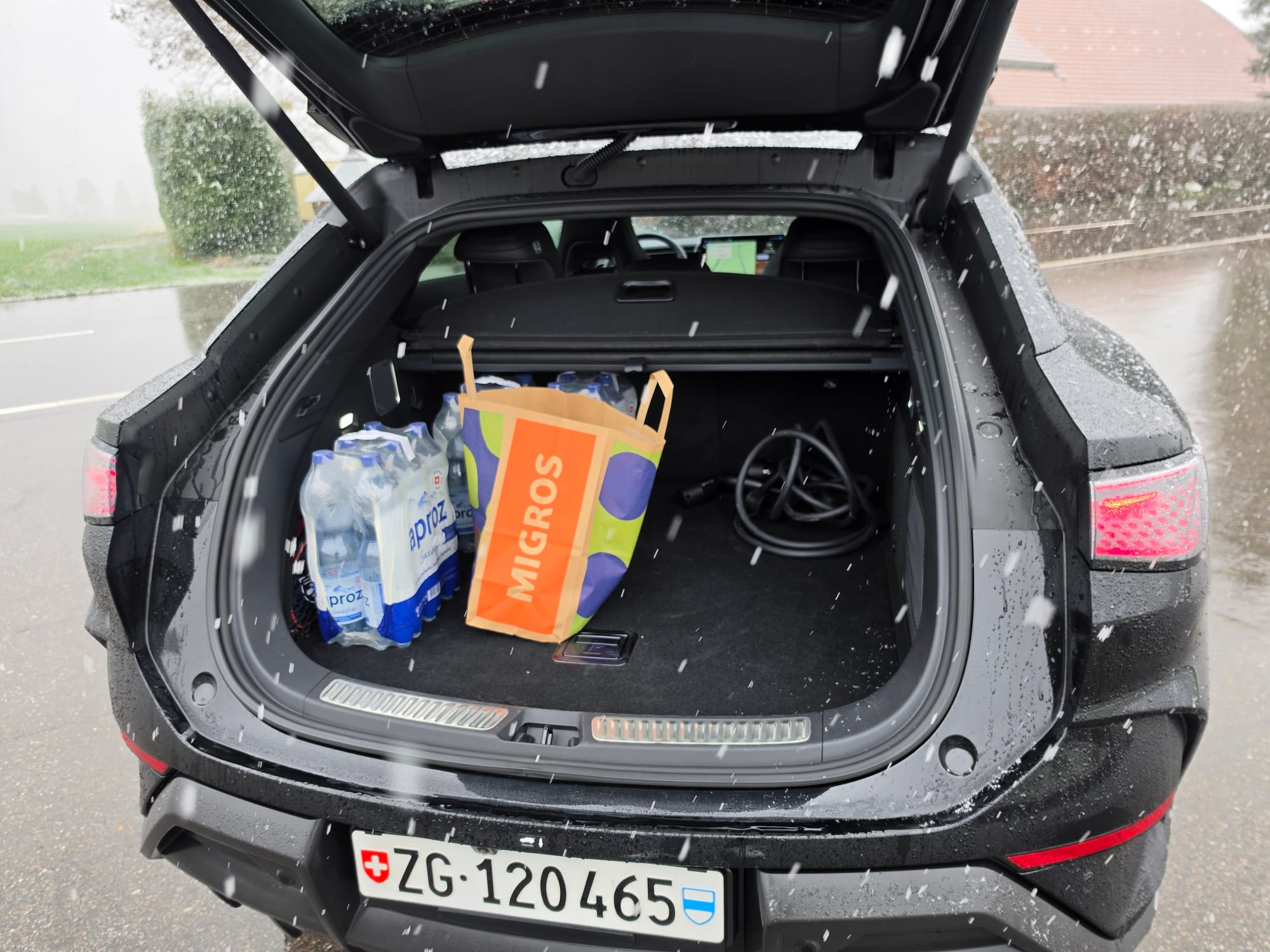 BYD gibt das Kofferraumvolumen mit bis zu 520 Litern an. Unterhalb der Abdeckung befindet sich ein zusätzliches Staufach. Bei umgeklappten Rücksitzen erweitert sich das Volumen auf bis zu 1789 Liter. Unter der Kühlerhaube vorne befindet sich ausserdem ein Frunk mit 58 Litern. Darin passt beispielsweise das Ladekabel perfekt hinein. Insgesamt geht die Grösse des Kofferraums in Ordnung, ohne dabei zu überraschen. Bei viel Gepäck, besonders grösseren Koffern, dürfte es jedoch etwas knapp werden.