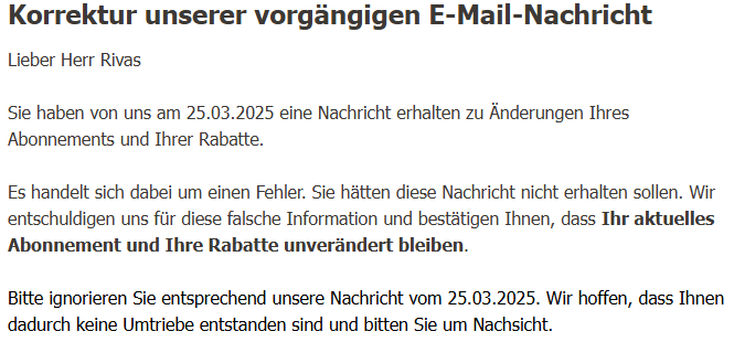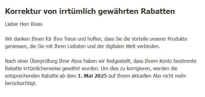 Doch genau diese Promotion wurde mir laut Mail von Sunrise fälschlicherweise gewährt. Die Mail flatterte am 25.03.2025 in meine Mailbox und überraschte mich - nicht gerade positiv, versteht sich. Ich habe die Promotion nicht irgendwie auf dubiosen Wegen erhalten, sondern sie wurde mir damals aktiv von Sunrise angeboten. Wieso sie scheinbar aus Versehen gewährt wurde, ist mir also ein Rätsel.