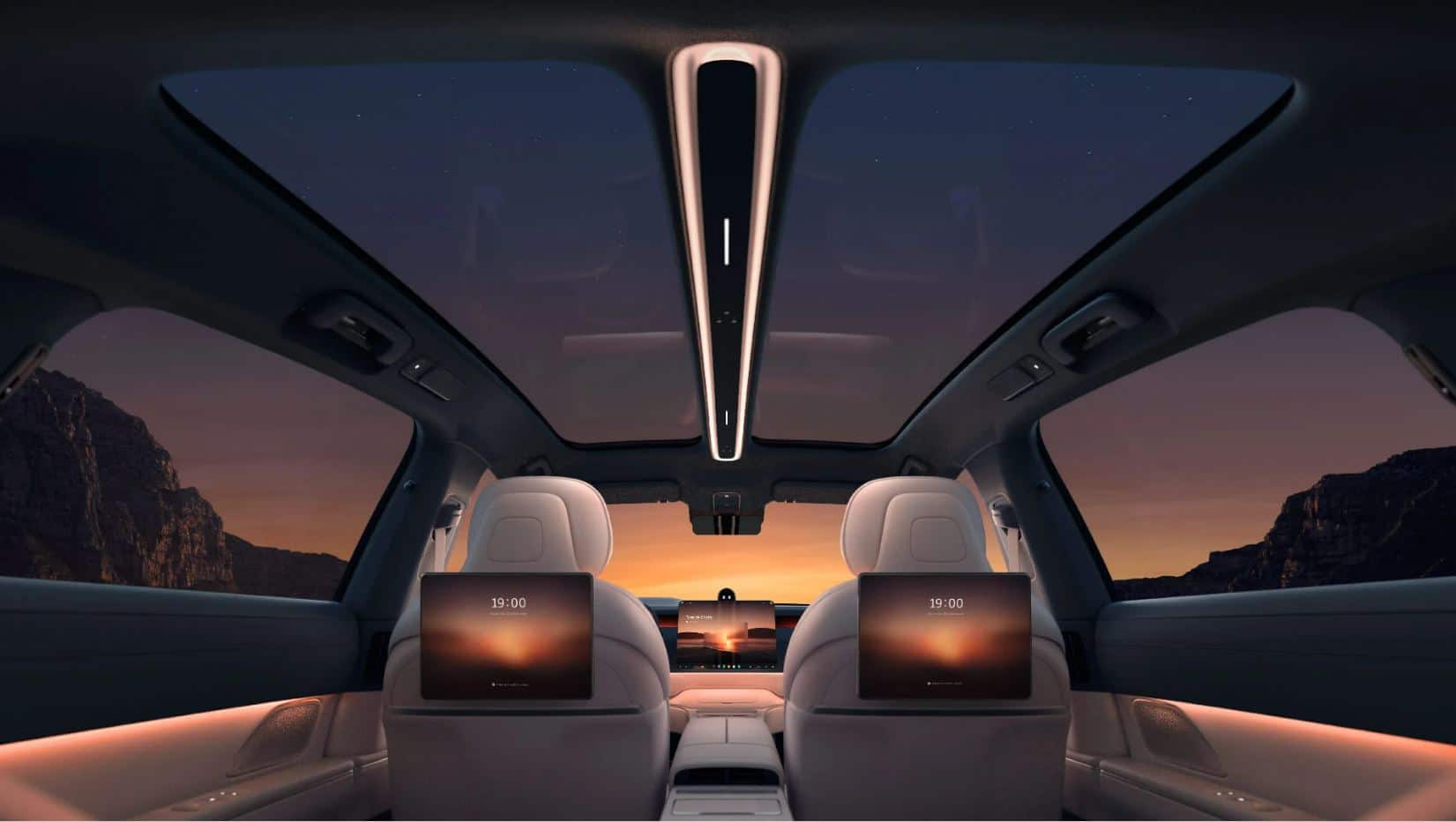 Im Cockpit gibt es ein grosses 15,6 Zoll Touchscreen-Display, auf dem alle relevanten Informationen angezeigt und das Infotainment-System bedient werden kann. Im Fond gibt es darüber hinaus zwei Bildschirme für die Mitfahrer:innen und ein zusätzlicher 8 Zoll Monitor auf der Mittelkonsole, die sich von vorne nach ganz hinten durchzieht.
