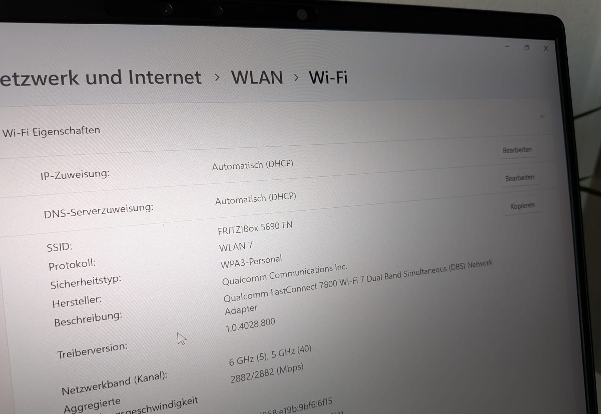 Was die Konnektivität betrifft, da lässt das Notebook von Dell kaum Wünsche übrig. Kabellos wird Wi-Fi 7 und Bluetooth 5.4 unterstützt. Damit ist es für die Zukunft gewappnet. Allerdings muss an dieser Stelle erwähnt werden, dass Windows 11 zum aktuellen Zeitpunkt noch gar kein Bluetooth 5.4, sondern "nur" 5.3 unterstützt. Mangels Router, der auch Wi-Fi 7 unterstützt, kann ich nichts dazu sagen. Was ich aber sagen kann, ist, dass es mit meinem Wi-Fi 6-Router zu keinen Problemen kam und sich die Geschwindigkeit auf tadellosem Niveau befand.