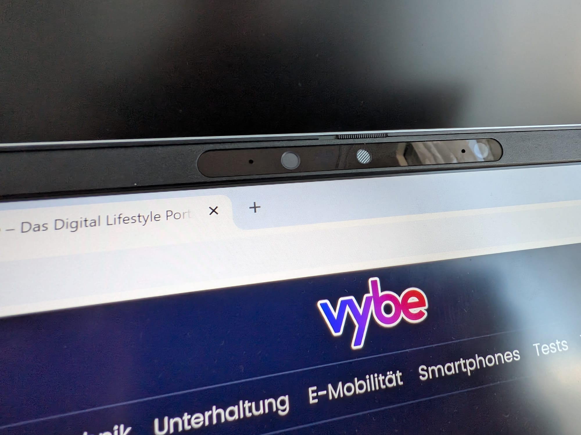 - Oberhalb des Displays gibt es mittig eine 1080p-Webcam. Mit ihr lassen sich erfreulich gute Videocalls durchführen, da sie auch unter schwierigen Lichtverhältnissen stets gute Ergebnisse liefert. Im Sinne des Datenschutzes gibt es auch eine physische Schutzblende. Sie lässt sich über den Auslöser der Webcam schieben.