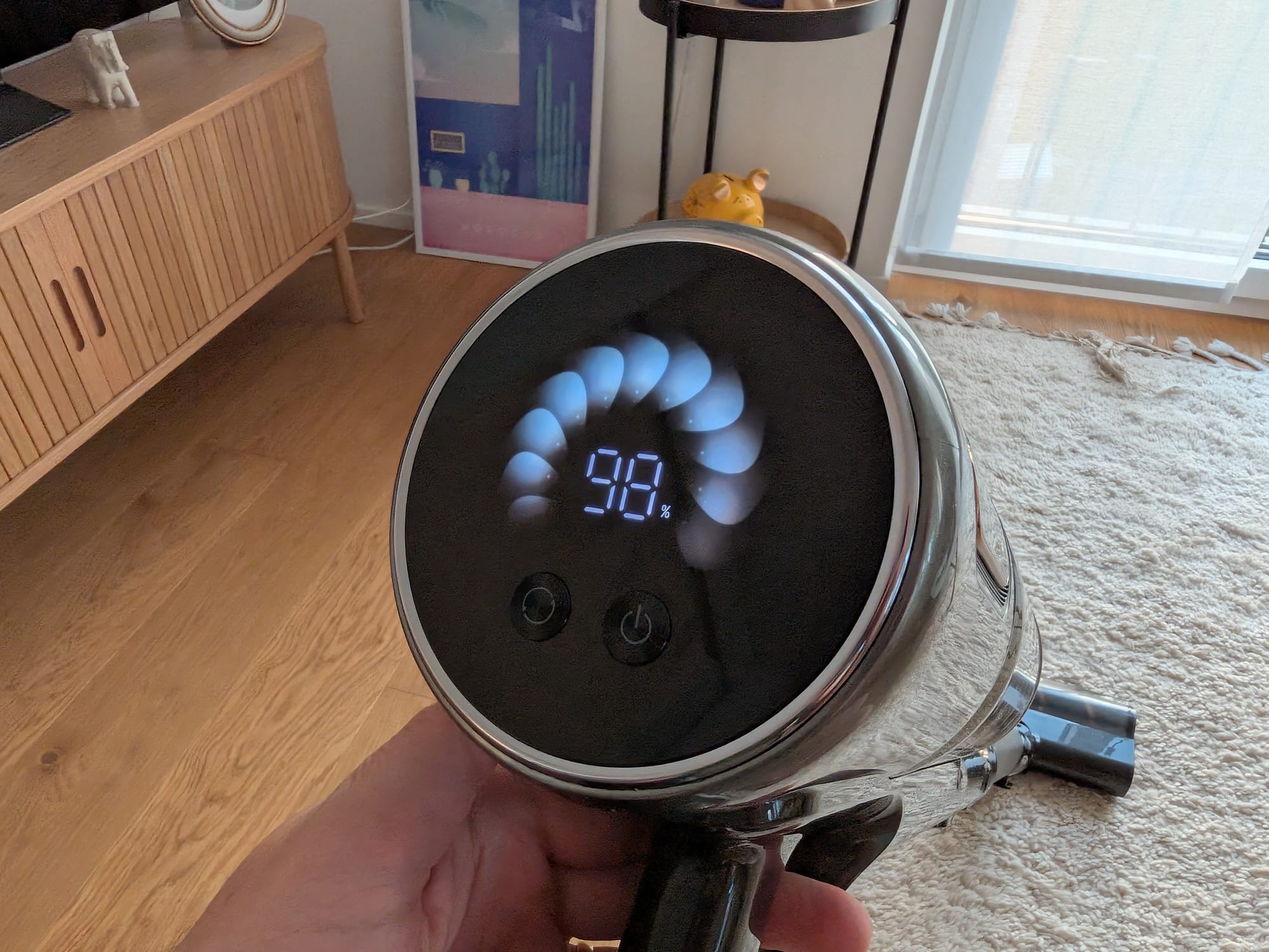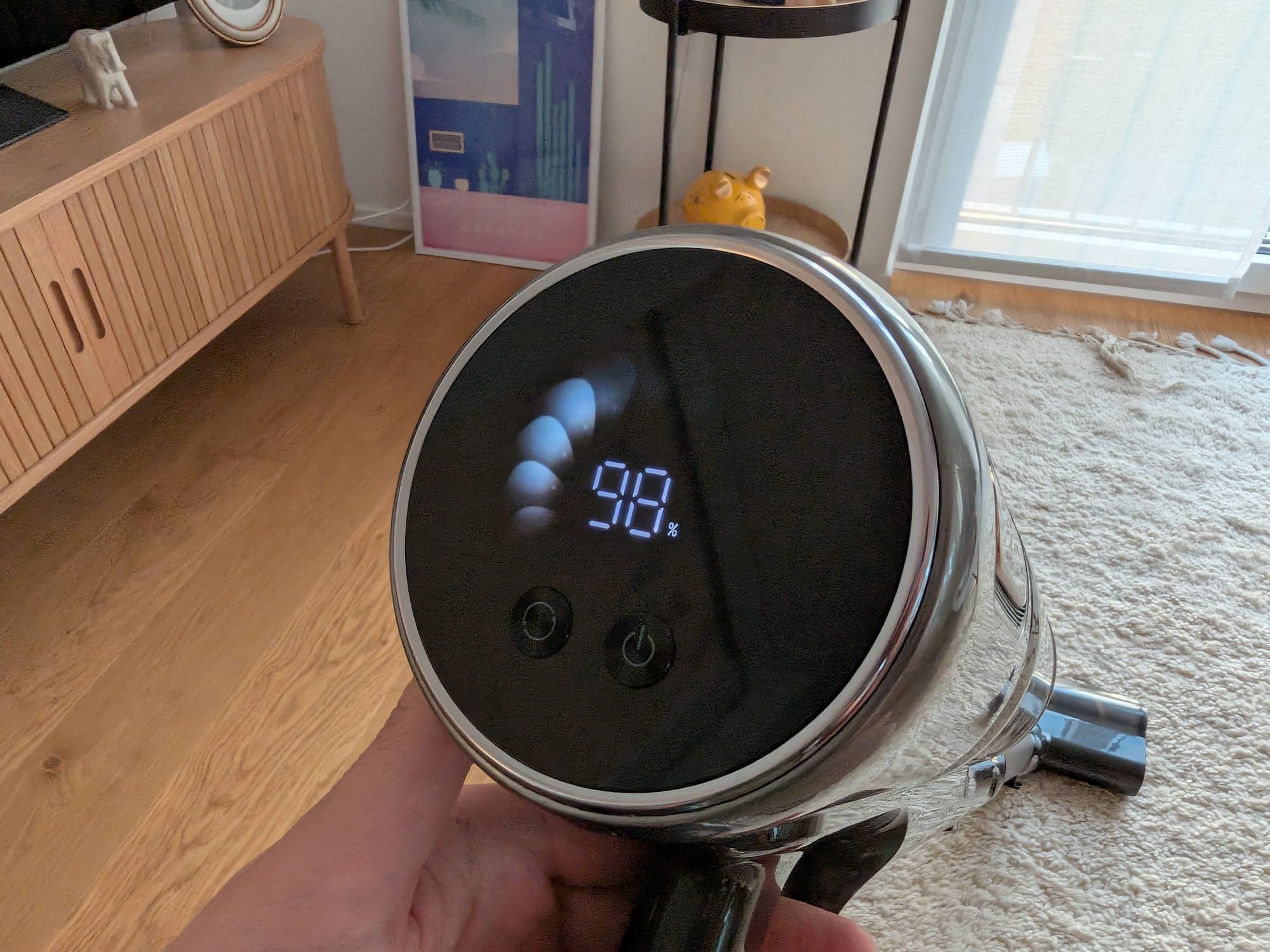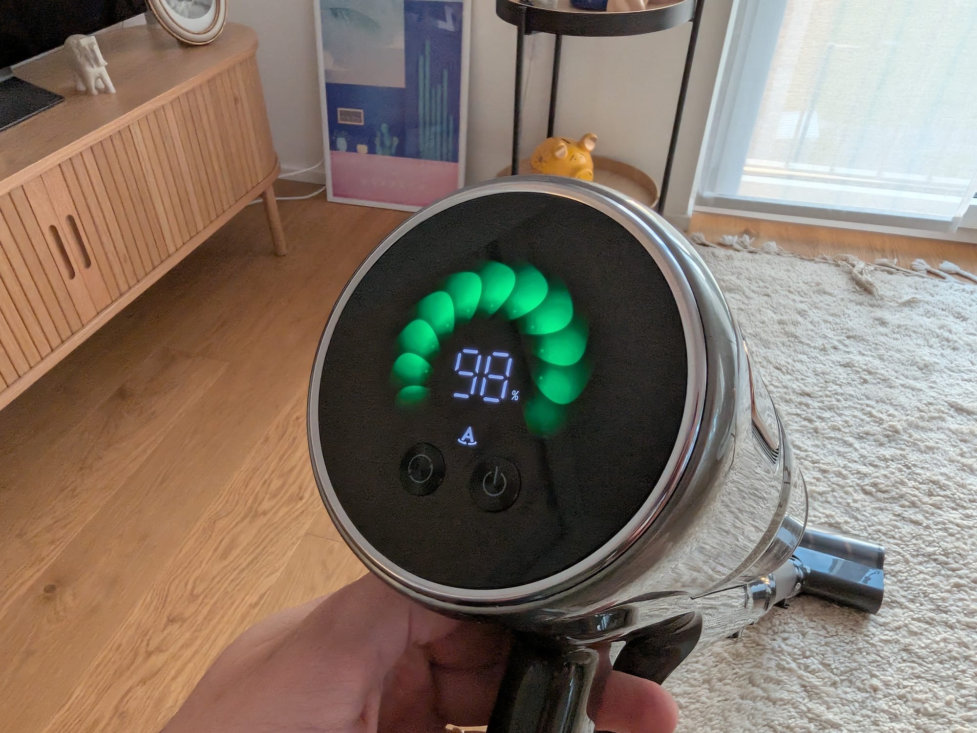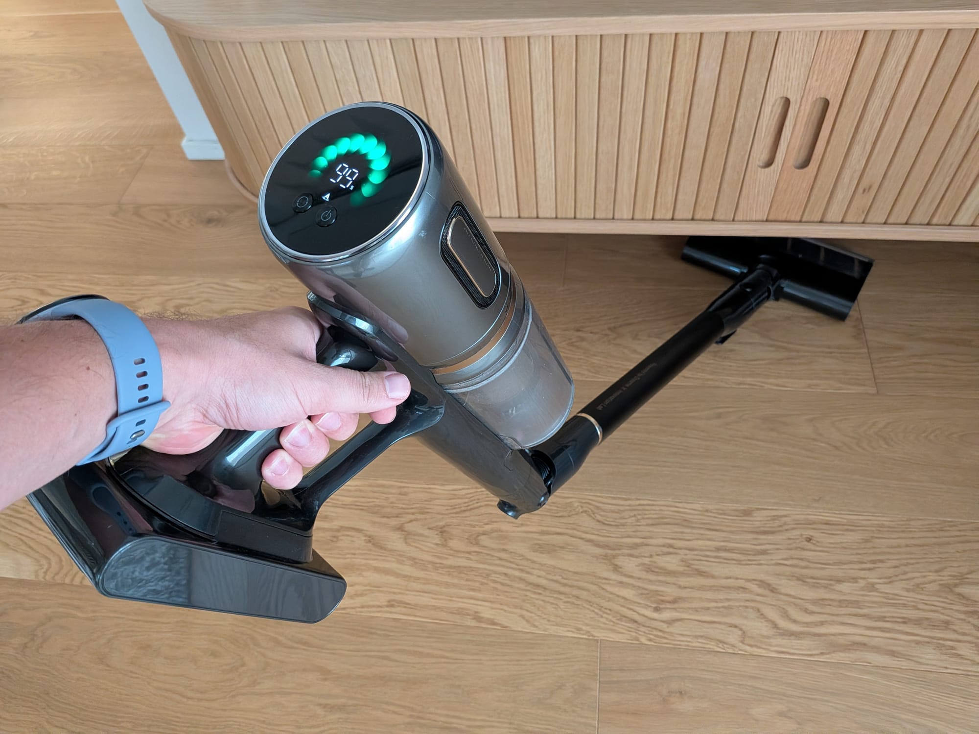 Doch fangen wir zunächst mal mit dem Handling des Dreame V20 Pro an. Mit einem Gewicht von insgesamt ca. 2,5 Kilogramm ist er zwar nicht extrem leicht, aber auch nicht schwerer als der Dyson V15 Detect, den wir bisher im Einsatz hatten. Im Vergleich zum Dyson ist mir am Dreame sofort positiv aufgefallen, dass es keinen Abzug gibt, der permanent gedrückt werden muss, um zu saugen. Ist der Staubsauger einmal eingeschaltet, läuft er, bis er wieder über die Taste ausgeschaltet wird. Das ist in meinen Augen die deutlich komfortablere Lösung.