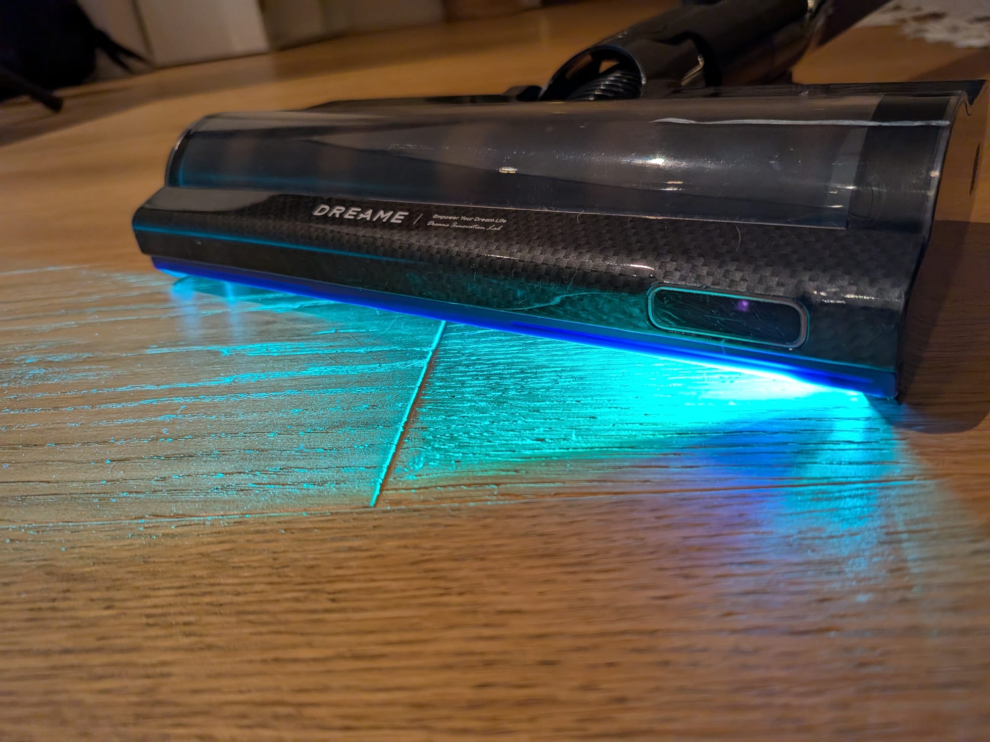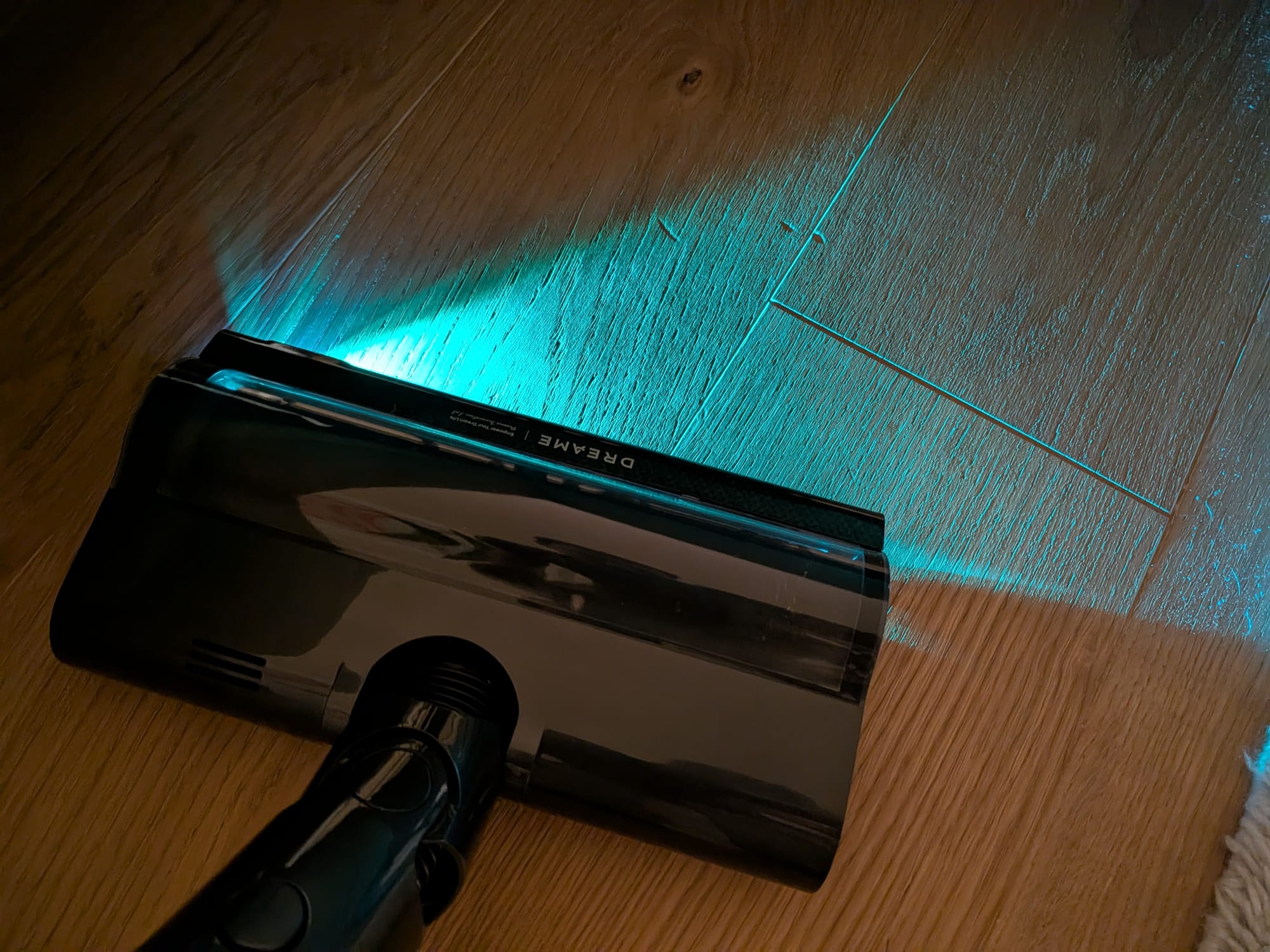 Was ich bei unserem Dyson schon zu schätzen wusste, war die integrierte LED-Beleuchtung. Glücklicherweise muss ich darauf auch beim Dreame V20 Pro nicht verzichten. Anstelle einer grünen Beleuchtung gibt es bei Dreame ein hellblaues Licht. Dieses ist zwar etwas weniger stark als das Licht des Dyson V15 Detect, reicht aber völlig aus, um Schmutzpartikel mit blossem Auge zu erkennen.