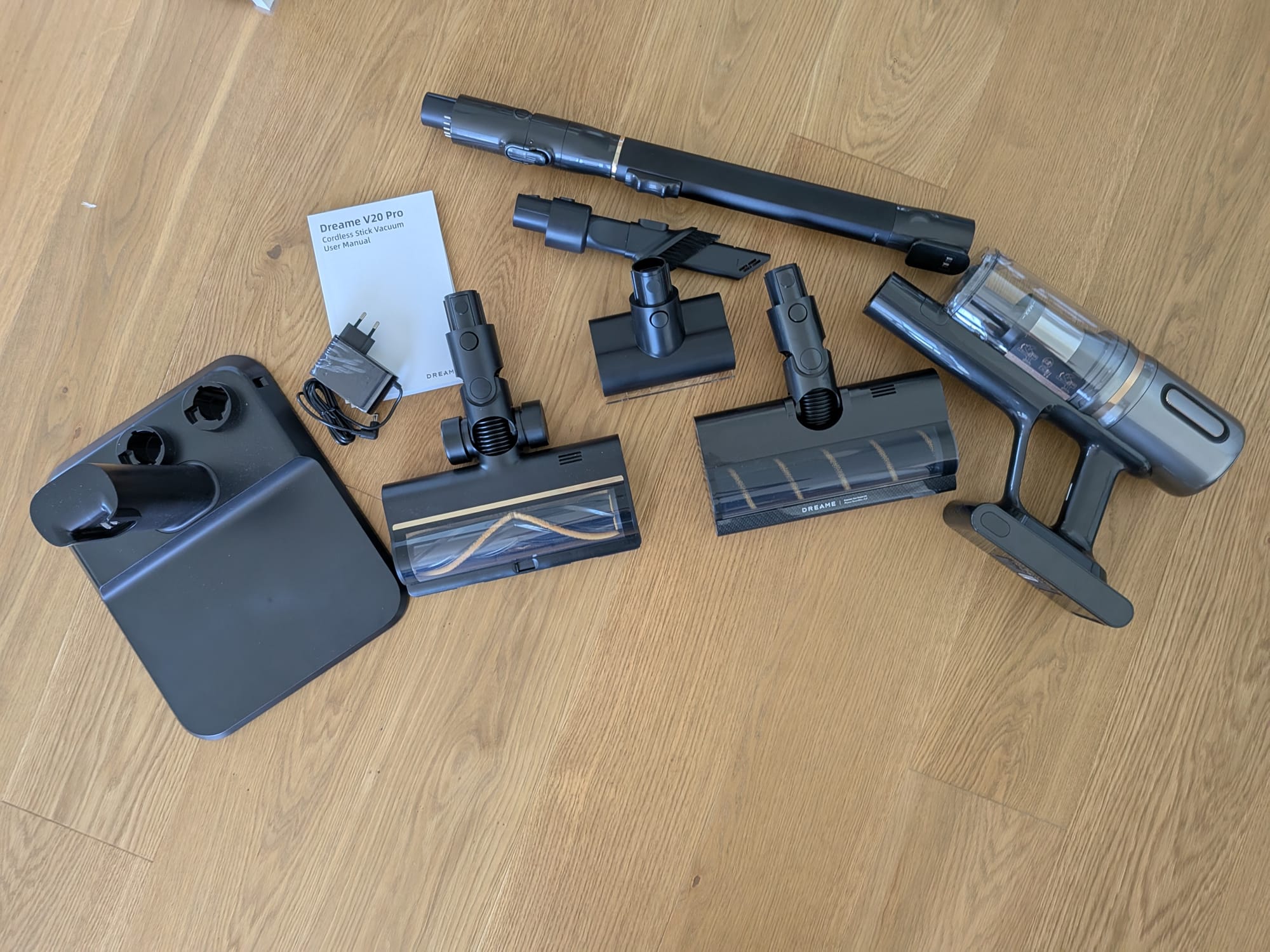 Der Dreame V20 Pro ist aktuell für rund 380 Franken erhältlich, entweder direkt beim Hersteller oder bei einem Fachhändler. Der akkubetriebene Staubsauger wird mit reichlich Zubehör ausgeliefert. Im Paket finden wir unter anderem Folgendes vor: