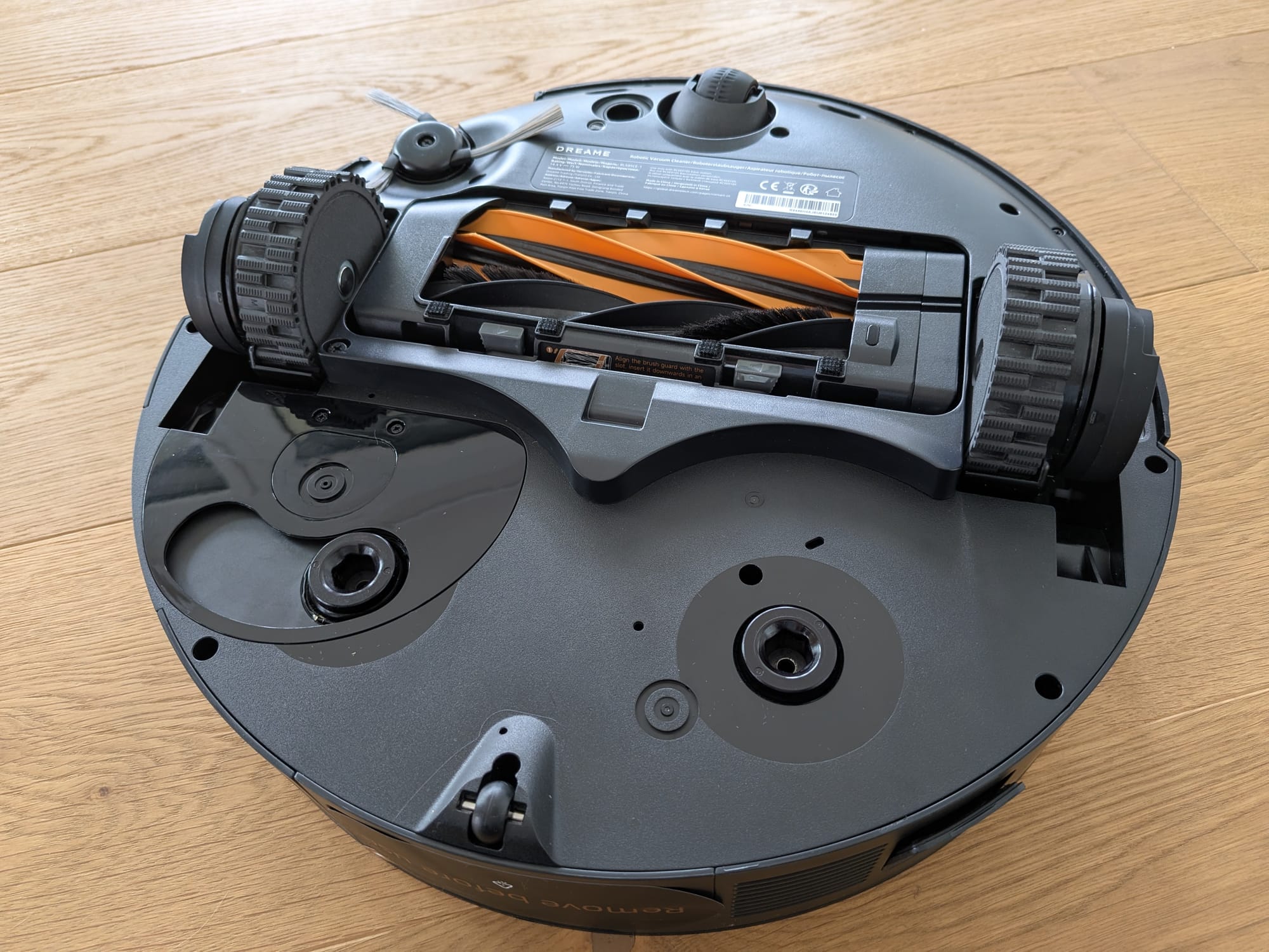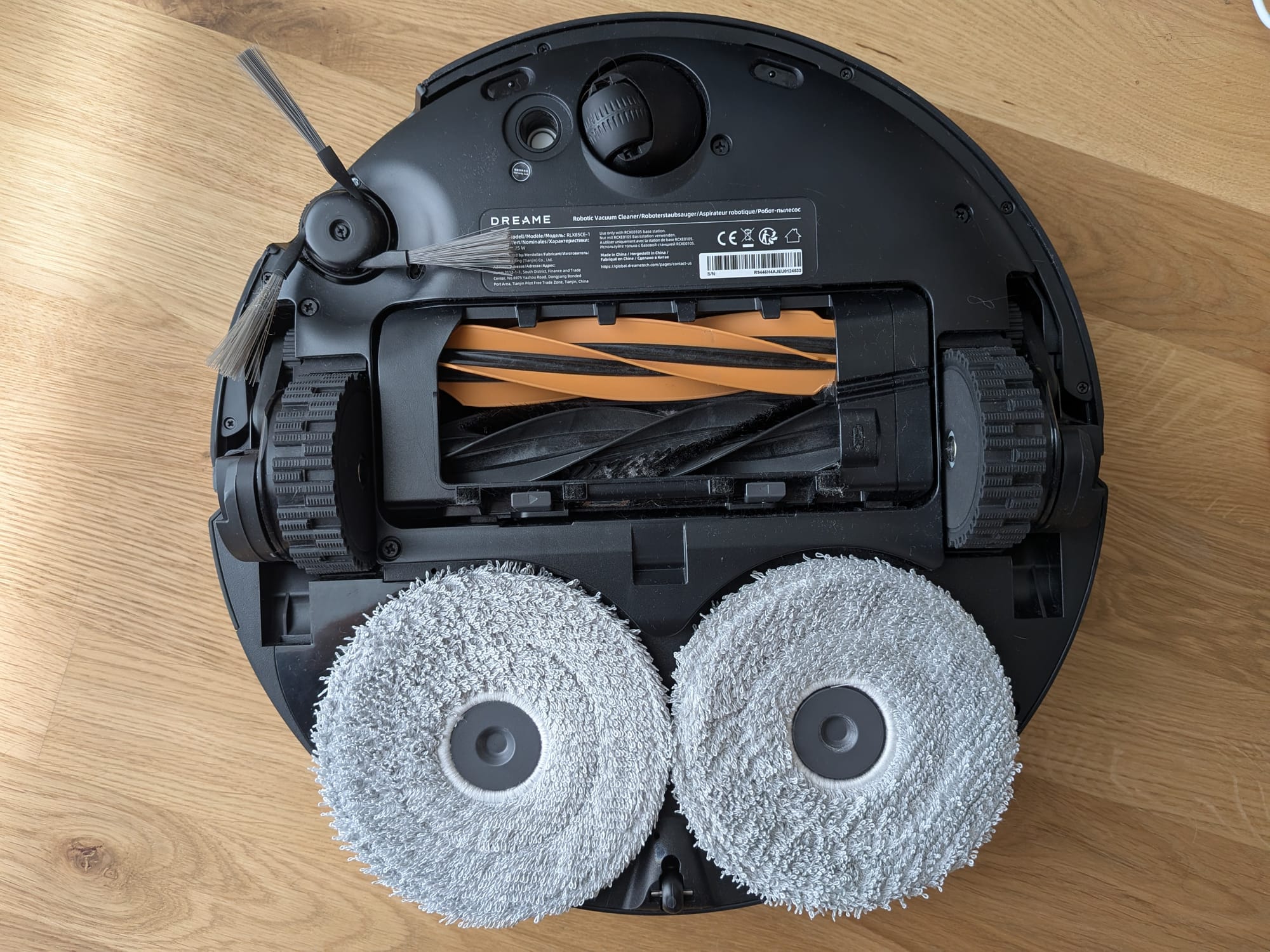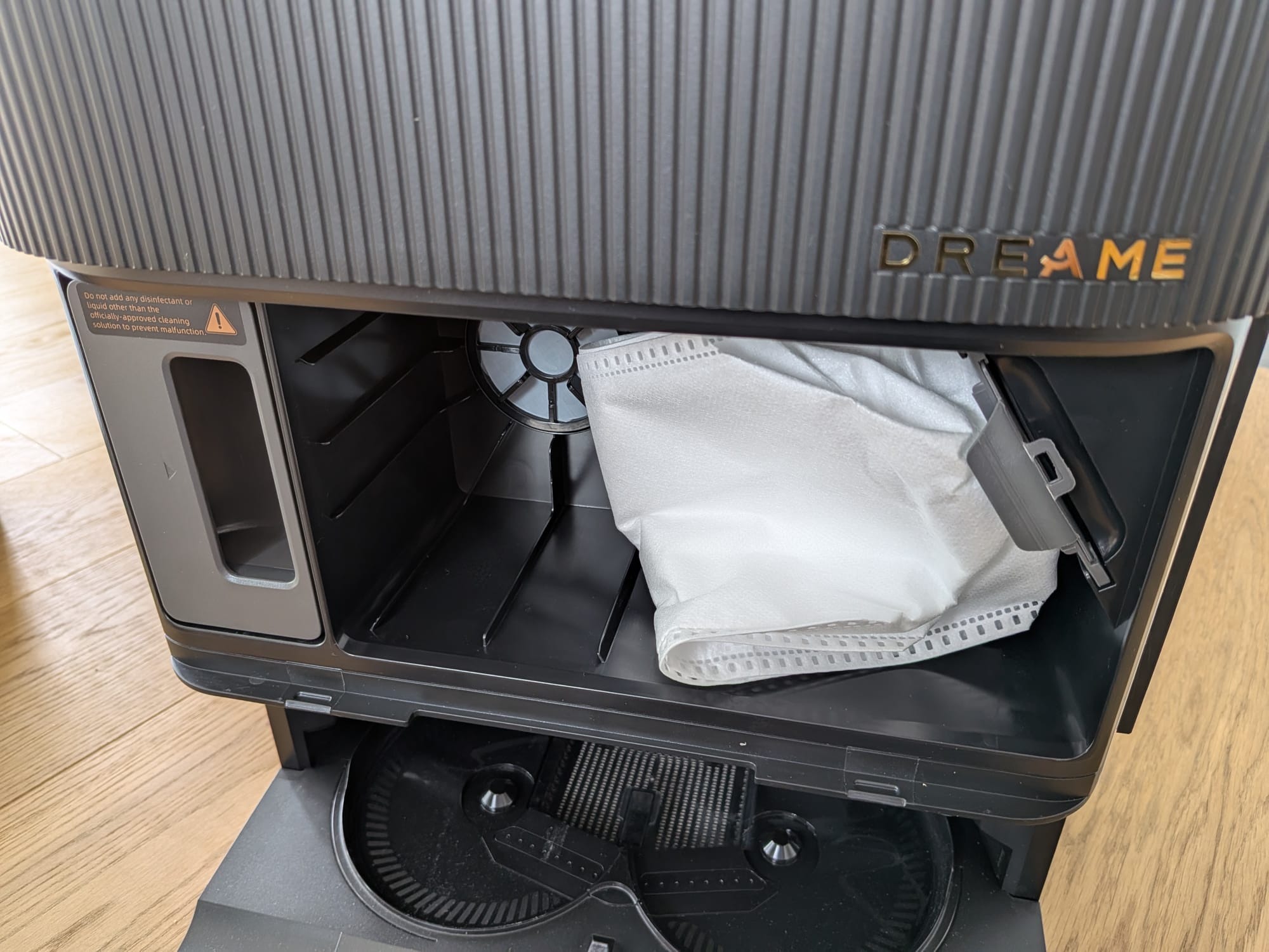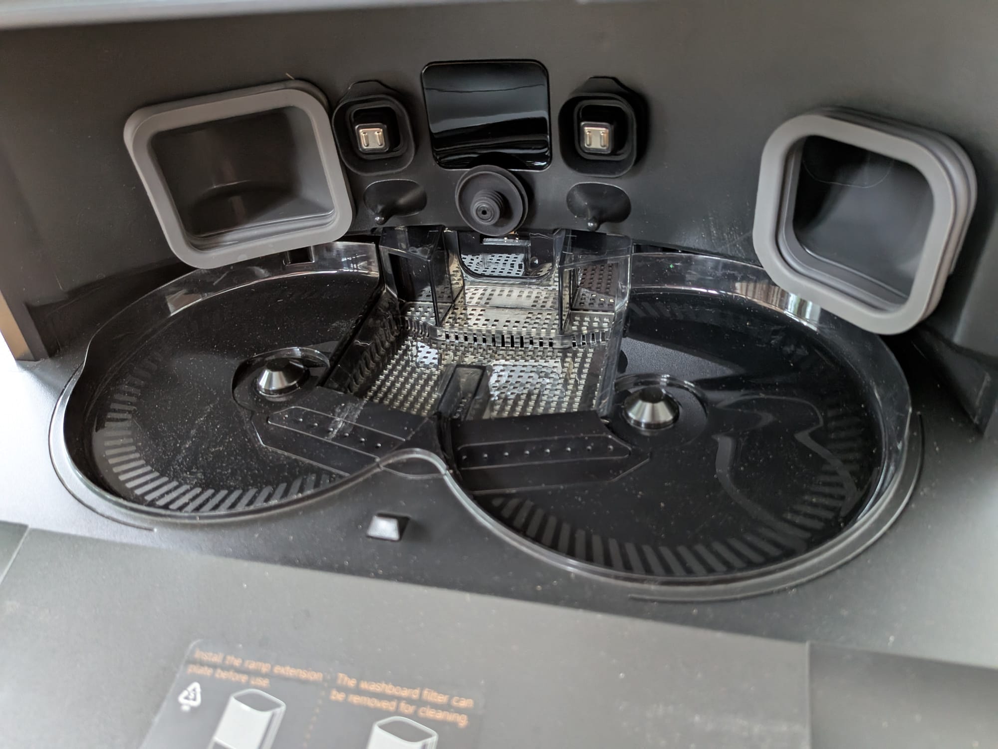 Unter der Haube gibt es nicht so viel spannendes zu sehen. So gibt es einen QR-Code, der auf die Dreamehome-App hinweist, einen kleinen Resetknopf mit Anzeige des WLAN-Status und den integrierten Staubbehälter. Letzterer muss einzig zur Reinigung des Filters hin und wieder entnommen werden, da die automatische Leerung jeweils direkt von der Multifunktionsreinigungsstation übernommen wird.