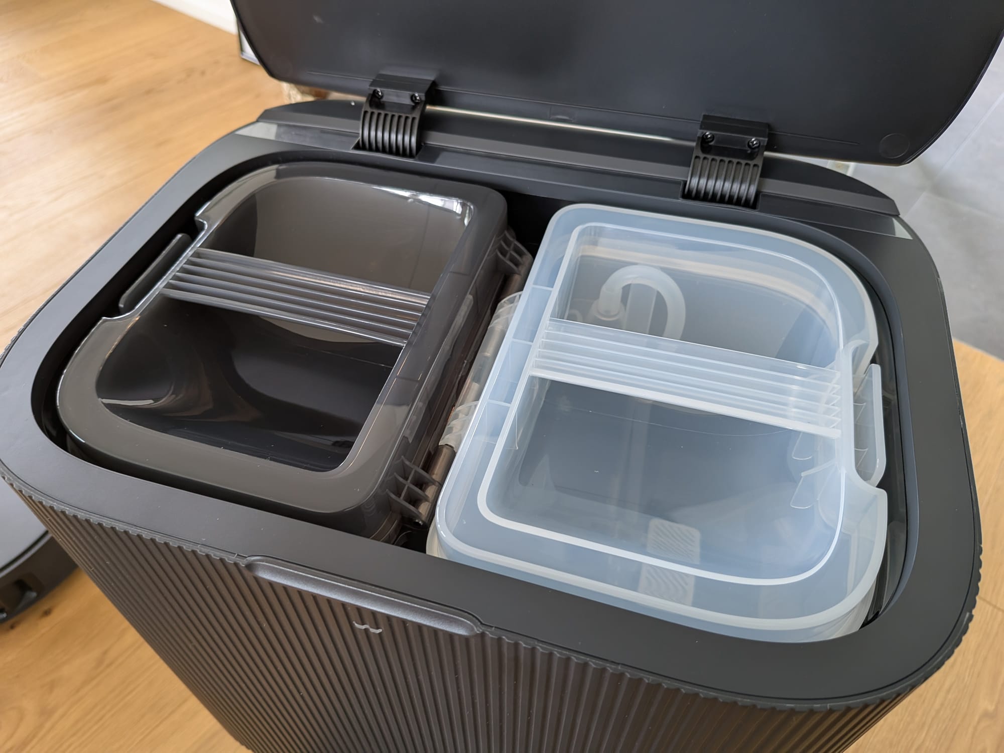 Auf der Oberseite der Station befindet sich ein klappbarer Deckel. Darunter verbirgen sich der Frisch- und Schmutzwassertank. Sie unterscheiden sich deutlich voneinander: Der Frischwassertank ist weiss und transparent, der Schmutzwassertank ist schwarz und ebenfalls leicht transparent. Wenn der Frischwassertank leer oder der Schmutzwassertank voll ist, wird dies über die Dreamehome-App mitgeteilt. In jedem Fall empfiehlt es sich, den Schmutzwassertank regelmässig, d.h. nach jeder Reinigung, zu leeren. Sonst kann es zu unangenehmen Gerüchen kommen. Neu bietet der Frischwassertank auch ein integriertes Kalkschutzmittel. Laut Dreame sollte das Mittel alle 18 bis 36 Monate ausgetauscht werden.