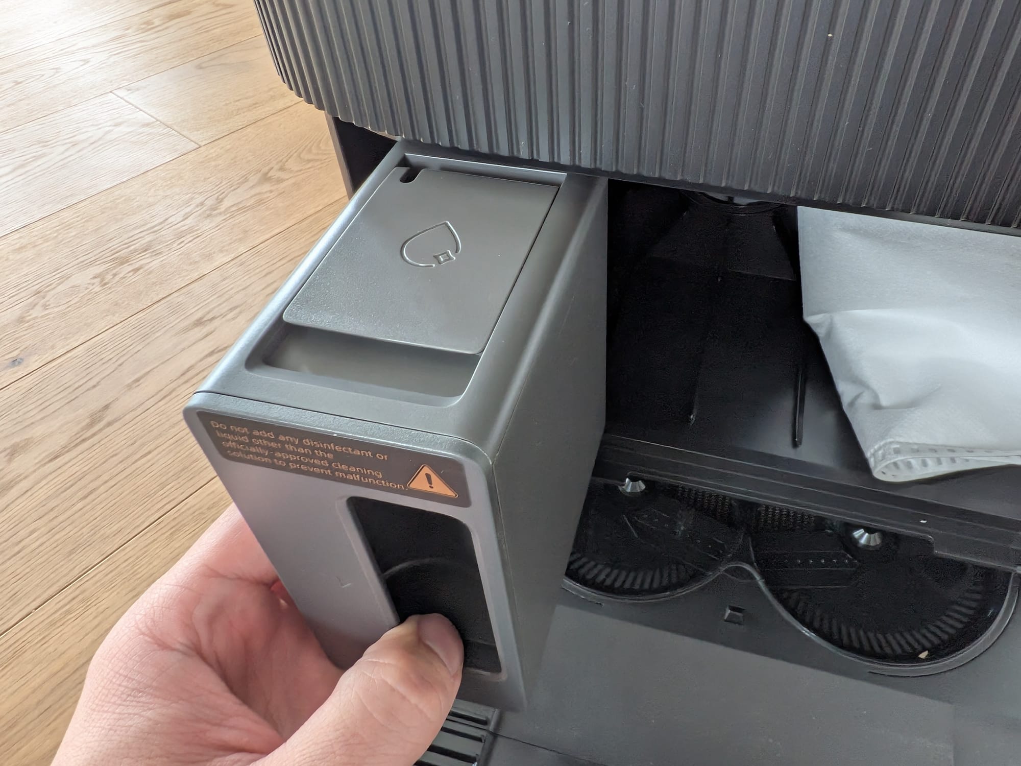 Unter der vorderen Abdeckung der Multifunktionsreinigungsstation befinden sich der Tank für die Reinigungslösung und den Staubbeutel. Der Tank für die Reinigungslösung kann herausgenommen werden. Die Reinigungslösung wird einerseits zur Reinigung der Wischpads benötigt und andererseits dem Frischwasser des Saugroboters dosiert zugegeben. Der vom Saugroboter eingesaugte Schmutz wird mitteils Unterdruck in den Staubbehälter eingezogen. Gut gelöst: Ist der Staubbehälter voll, und das dauert erfreulicherweise ziemlich lange, verschliesst sich der Staubbehälter automatisch. So wird verhindert, dass nach der Entnahme des Behälters noch Schmutz austreten kann.