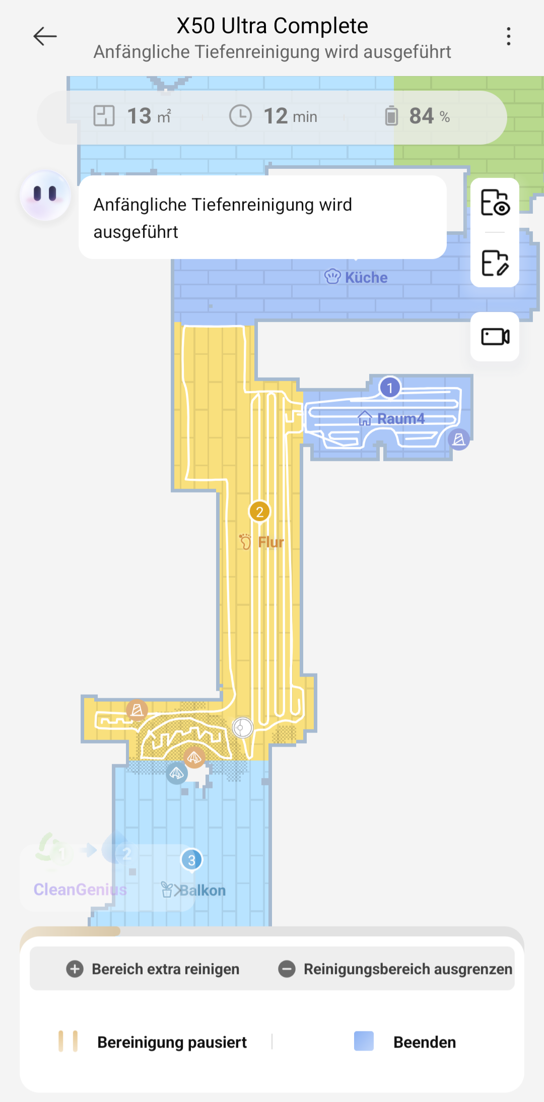 Wer sich nicht allzu sehr mit der App auseinandersetzen möchte, der sollte den Saugroboter einfach selbstständig machen lassen. Dies setzt die CleanGenius-Funktion um. Durch diese intelligente Funktion, die durch KI unterstützt wird, soll ein möglichst hohes Reinigungsergebnis erreicht werden. Wer dann doch "manuell" eine Anpassungen an diesem Modus vornehmen möchte, kann dies selbstverständlich tun. Innerhalb der CleanGenius-Funktion kann der Reinigungsmodus (Staubsaugen und Wischen gleichzeitig oder Wischen nach dem Saugen) sowie eine spezielle Tiefenreinigung bei Bedarf aktiviert werden. Ist sie aktiv, wischt und reinigt der Roboter die Bereiche intensiver, was jedoch zu einem erhöhten Wasserverbrauch führt.
