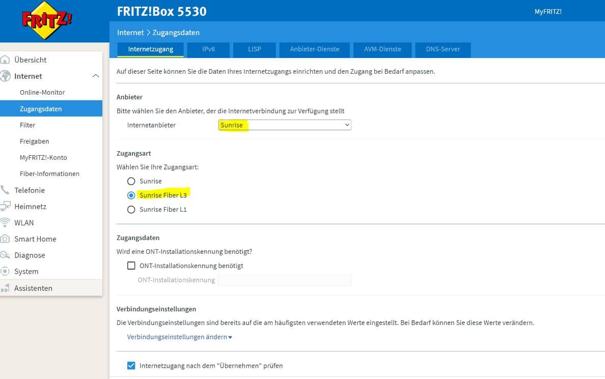 Wähle aus dem Menü unter „Internet” den Punkt „Zugangsdaten” aus. Hier musst du einerseits als Internetanbieter “Sunrise” (logisch..) auswählen und andererseits unter Zugangsart „Sunrise Fiber L3“. By-the-way: Für alle, die direkt über das Sunrise-Glasfasernetz ins Internet gelangen, die müssten „Sunrise Fiber L1“ auswählen. Bist du dir unsicher, auf welchem Netz du bist? Erkundige dich direkt bei der Sunrise-Hotline.