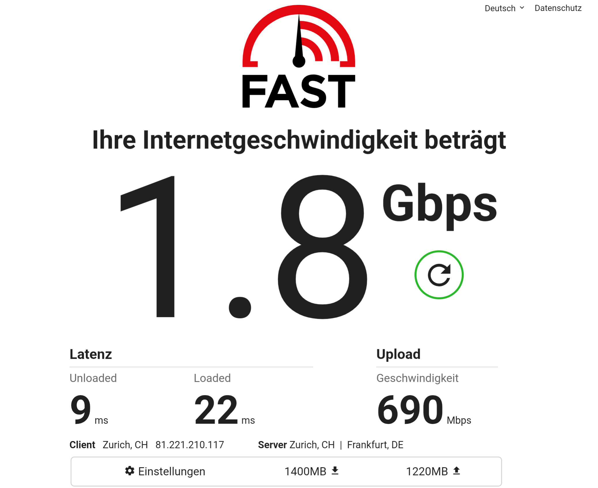 Ich habe die Fritz!Box 4690 an mein Provider-Router von Sunrise angeschlossen. Es handelt sich hierbei um die Connection Box 3 Fiber, die über kein Wi-Fi 7 unterstützt. Mein Glasfaseranschluss erreicht eine maximale Leistung von 2,5 Gbit/s im Down- und Upload.