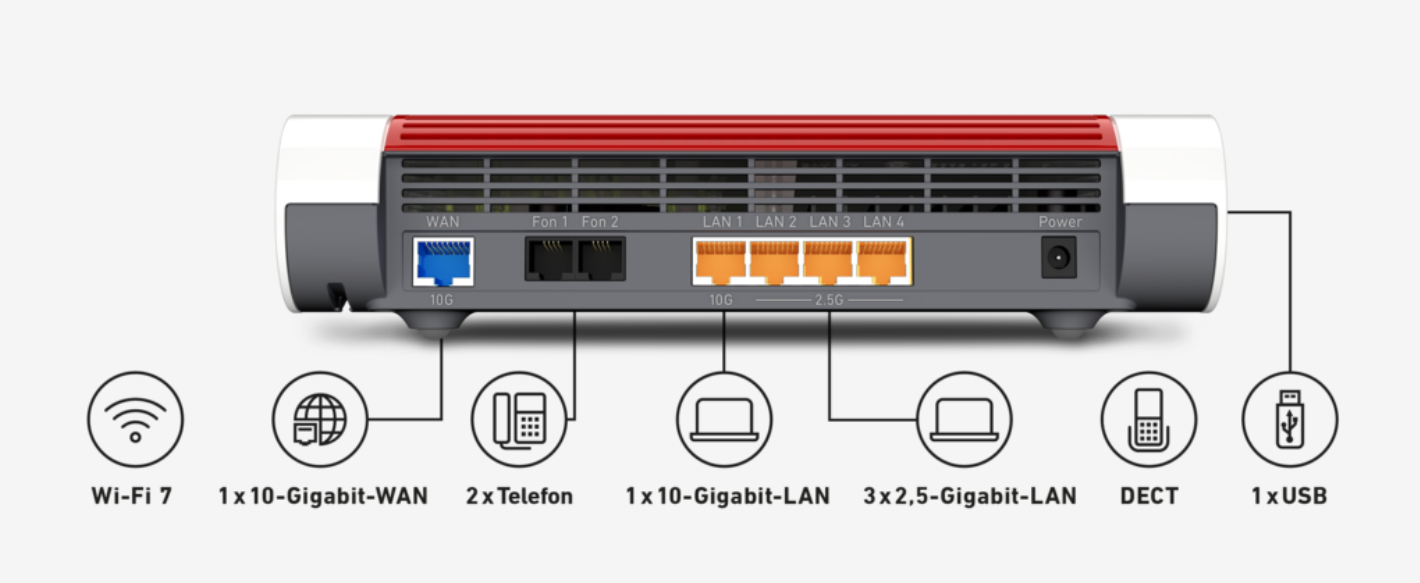 Werfen wir einen Blick auf die Ausstattung der Fritz!Box 4690. Wie bereits oben erwähnt, verfügt sie über zwei extrem schnelle 10-Gbit-Ethernet-Anschlüsse (WAN + LAN). Die Fritz!Box 4690 eignet sich somit optimal für die Nutzung eines schnellen Glasfaseranschlusses in der Schweiz, da hierzulande etliche Anbieter bereits Geschwindigkeiten von bis zu 10 Gbit/s oder gar mehr bieten. Ausserdem verfügt sie über drei weitere 2,5-Gbit-Ethernet-Anschlüsse.