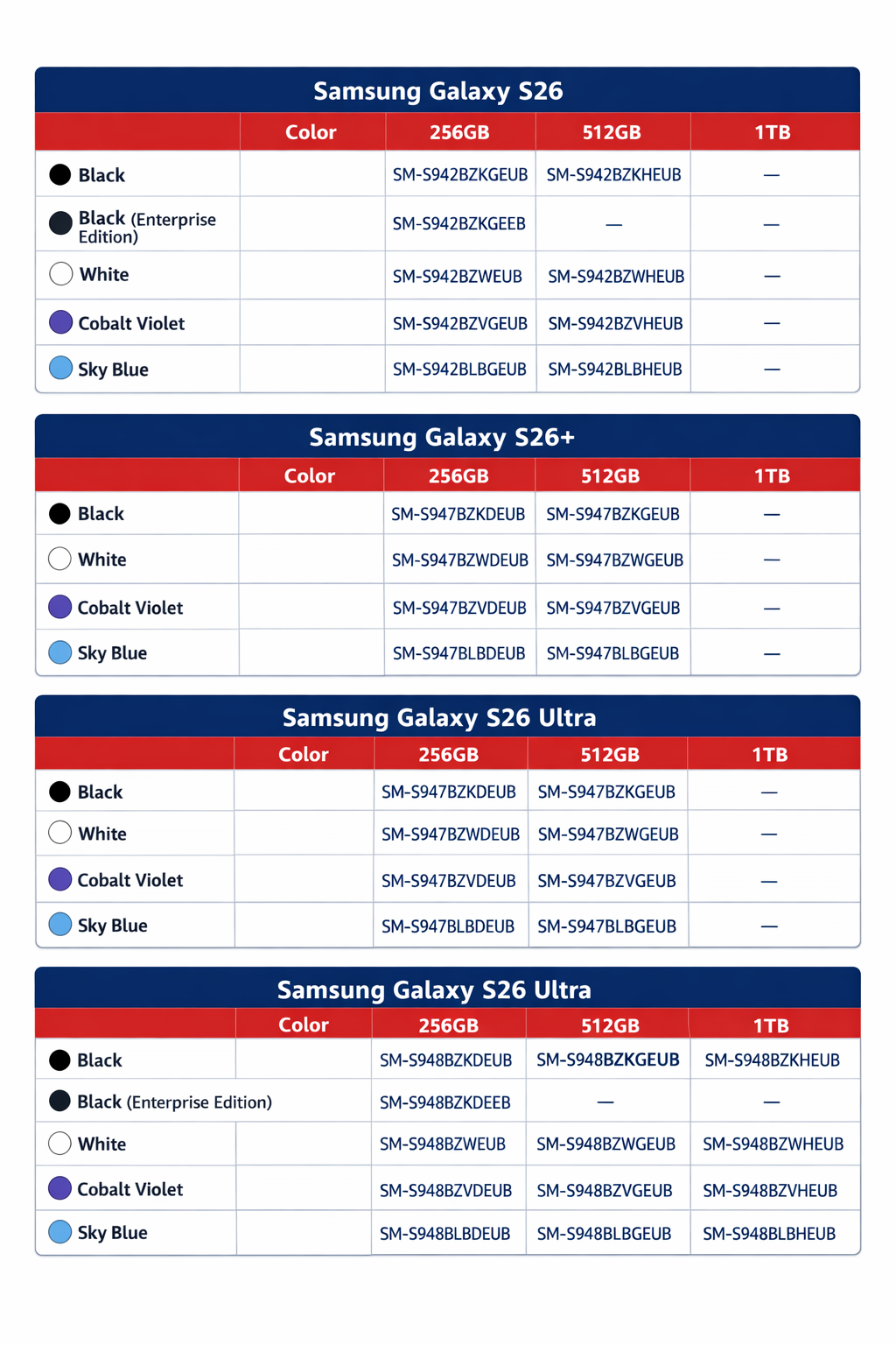 Die Galaxy S26-Serie wird voraussichtlich am 25. Februar 2026 vorgestellt. Verkaufsstart ist entweder der 10. oder 11. März 2026. Folgend die Übersicht aller geplanten Farb- und Speichervarianten inkl. Bezeichnung: