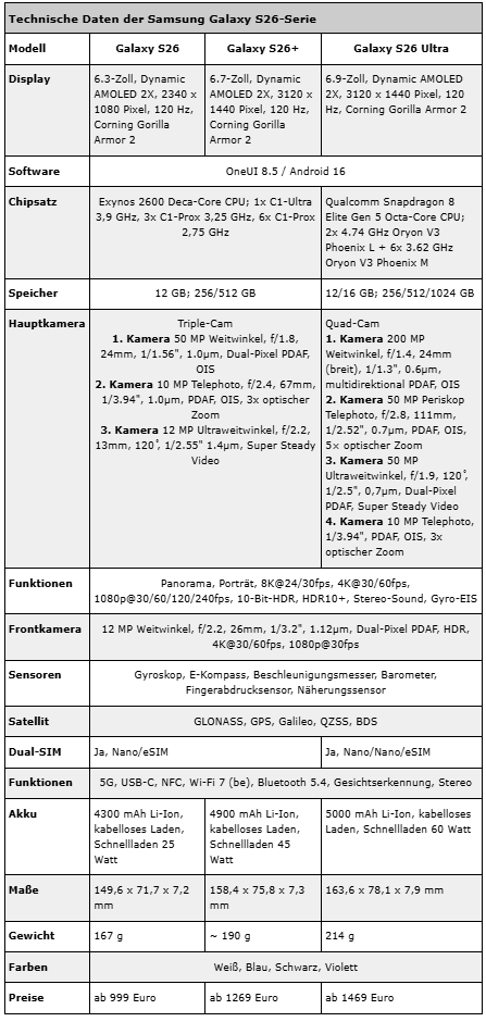 Galaxy S26, Galaxy S26+ und Galaxy S26 Ultra: Die Spezifikationen in der Übersicht