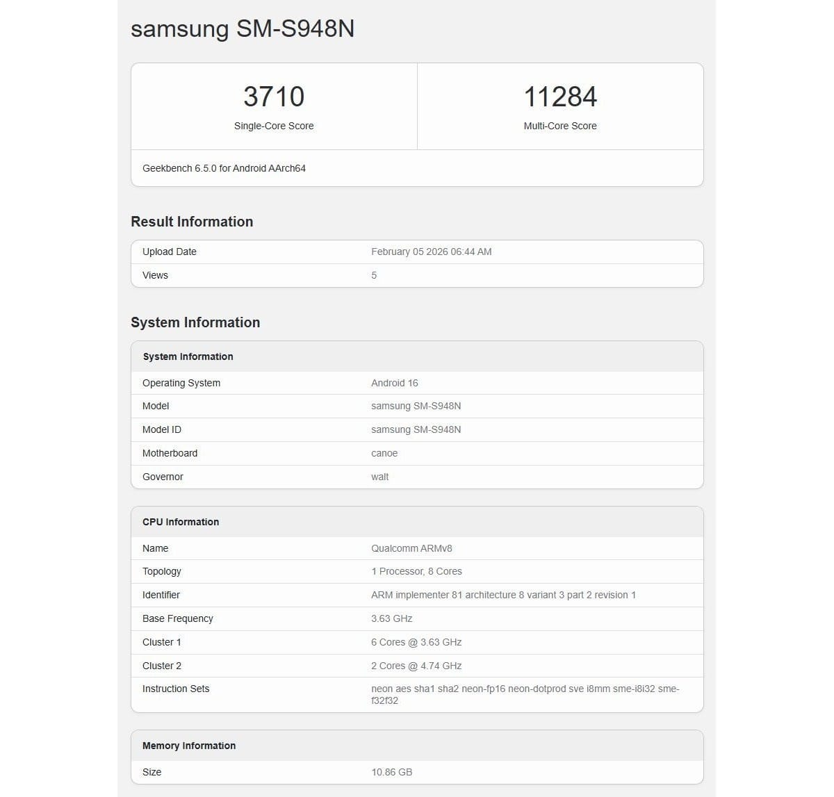 Nun ist auch ein Geekbench-Eintrag zum Galaxy S26 Ultra mit der Modellbezeichnung SM-948B gesichtet worden. Obwohl es sich dabei um das Modell für den südkoreanischen Markt handelt, ist auch dieses wie erwartet mit dem Snapdragon 8 Elite Gen 5 for Galaxy ausgestattet. Im Test erreichte dieses Modell, das wie das Galaxy S26 mit 12 GB RAM ausgestattet ist, Single-Core-Werte von 3600 Punkten und Multi-Core-Werte von 10686 Punkten.