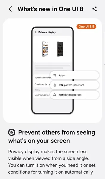 Genau hier kommt Samsungs neues Privacy Display (Privatsphären-Display) zum Einsatz. Es simuliert quasi das Anbringen einer Schutzfolie direkt durch das Display. Neugierige Blicke des Sitznachbarn sollen so verhindert werden – ganz ohne zusätzliche Displayfolie. Nun sind die ersten offiziellen Renderbilder zu dieser Funktion in der Samsung-Tips-App entdeckt worden.