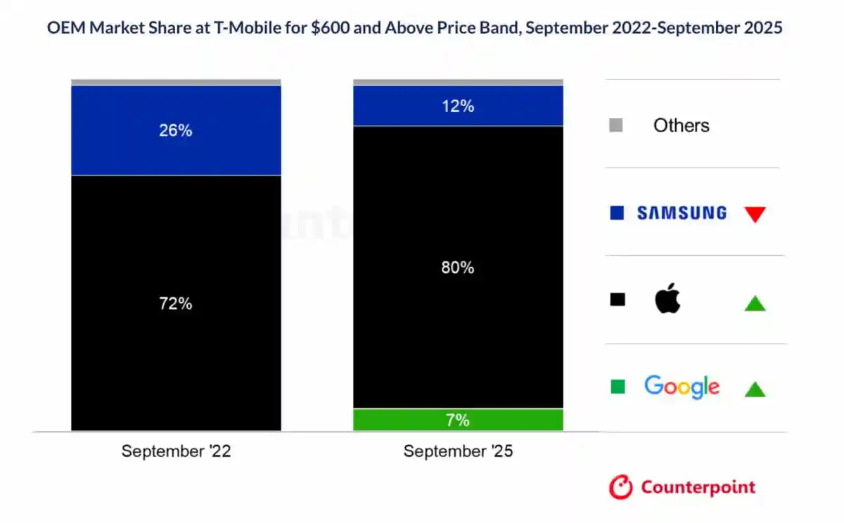Laut Counterpoint Research konnte Google vor allem mit dem sehr gut laufenden Pixel 10 Pro XL stark zulegen. Die Marktanteile heimste Google aber nicht etwa Apple ab, der nach wie vor in diesem Segment die Nase mit Abstand vorne hat, sondern von Samsung. Während der südkoreanische Hersteller im September 2022 auf einen Marktanteil von 26% kam, sind es jetzt nur noch 12%. Insgesamt sieben Prozent Marktanteil konnte sich Google im Premium-Segment erkämpfen.