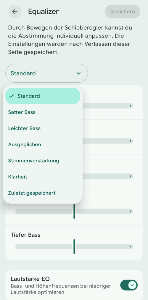 Optisch gefällt mir die Pixel-Buds-App sehr gut und sie bietet einen guten Umfang an Anpassungsmöglichkeiten. Sie ist übersichtlich und bietet beim Start direkt eine kurze Einführung in die Bedienung. Es gibt einen Equalizer, mit dem sich der Sound den eigenen Wünschen anpassen lässt. Wenn du keine Lust hast, dich mit dem einfach verständlichen Equalizer auseinanderzusetzen, dann kannst du auf sechs voreingestellte Hörprofile (u. a. satter Bass, leichter Bass, ausgeglichen, Stimmenverstärkung, Klarheit) zurückgreifen.