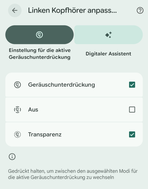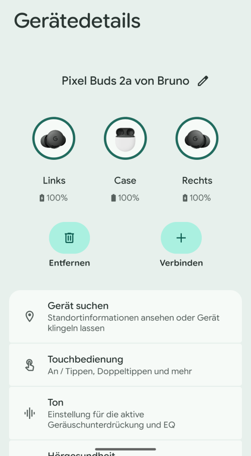 Die Touch-Gesten lassen sich übrigens über die Pixel-Buds-App für jeden Ohrhörer individuell anpassen. Allerdings lässt sich nur die Funktion bei gedrückter Geste zwischen den verschiedenen Modi (Geräuschunterdrückung, Transparenz oder aus) und dem digitalen Assistenten (Ein-/Ausschalten) anpassen. Auf Wunsch lässt sich die Touch-Bedienung auch komplett deaktivieren.