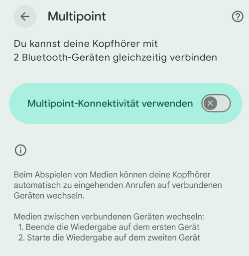 Wie es sich für wertigere Ohrhörer gehört, unterstützen auch die Pixel Buds 2a Multipoint-Bluetooth. Damit können die Ohrhörer gleichzeitig mit zwei Bluetooth-Geräten verbunden werden. Dabei hat der Wechsel zwischen verbundenen Geräten gut geklappt. Positiv ist auch, dass sich die Ohrhörer bei aktivierter Multipoint-Funktion bei einem eingehenden Anruf direkt mit dem Smartphone verbinden. So habe ich die Pixel Buds 2a neben dem Smartphone auch mit dem TV bzw. dem Google TV Streamer verbunden. Der Wechsel klappte dabei jeweils einwandfrei.