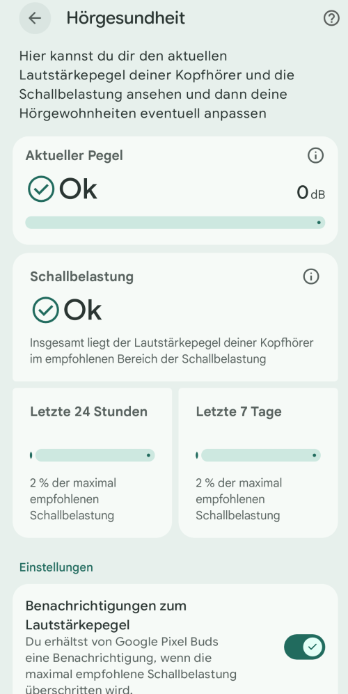 Lange Zeit laute Musik zu hören, kann dein Gehör nachhaltig schädigen. In der Pixel-Buds-App kannst du dir eine Übersicht der Schallbelastung der letzten Tage anzeigen lassen. Das Ziel? Damit erhältst du einen Überblick und kannst gegebenenfalls deine Hörgewohnheiten anpassen. Auch kannst du eine Benachrichtigung aktivieren, solltest du die maximal empfohlene Schallbelastung überschreiten.