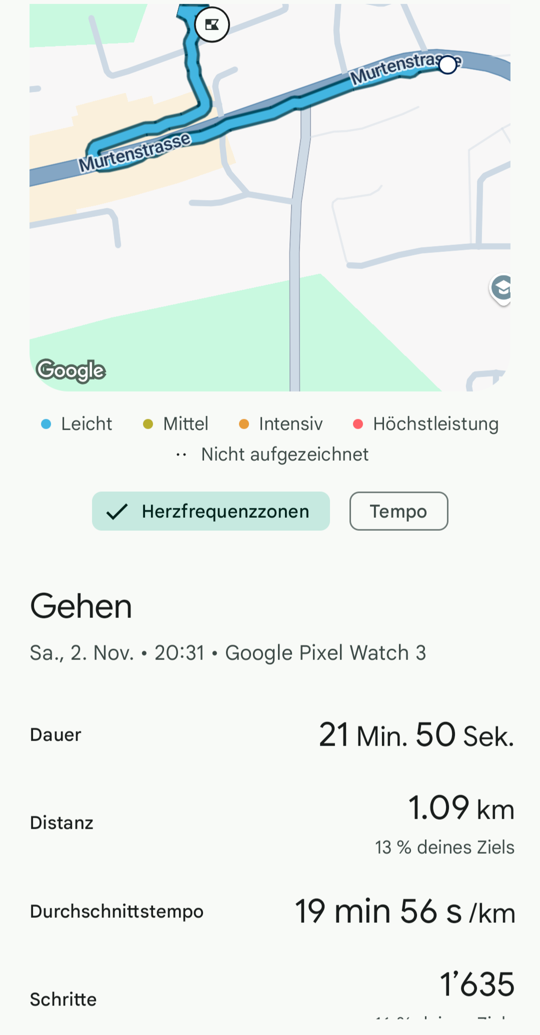 Da ich momentan verletzungsbedingt leider nicht Laufen und Fahrradfahren kann/darf, konnte ich die GPS-Funktioen nur bei Geheinheiten testen. Dabei überzeugte die Pixel Watch 3 mit einer schnellen Herstellung der GPS-Verbindung und einer anschliessend akkuraten Aufzeichnung. Die Daten der Pixel Watch 3 haben sich kaum von der Aufzeichnung der Apple Watch Ultra 2 unterscheidet. Das trifft übrigens auch auf die Herzfrequenzmessung zu. Sie zeigte beim Gehen nachvollziehbare und stets ähnliche Werte, wie bei der Watch Ultra 2, an.