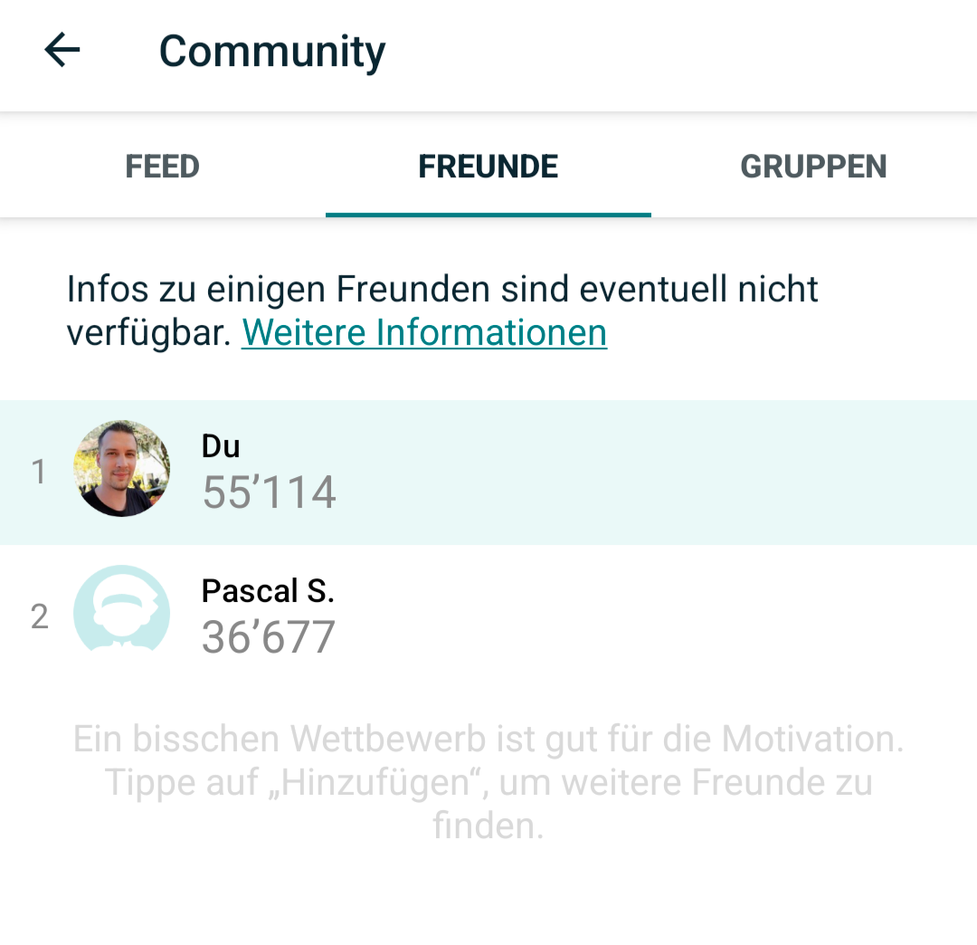 Ich messe meine Aktivitäten gerne mit meinem Redaktionskollegen Pascal Scherrer. Über eine Zeitlang waren wir beide im Apple-Universum unterwegs und haben uns da jeweils mit Challenges zu mehr Bewegung motiviert. Eine ähnliche, aber deutlich eingeschränktere Funktion bietet auch Google an. In der Fitbit-App kannst du dich über die Community-Funktion mit anderen messen, aber das halt leider nur sehr stark eingeschränkt. Es gibt etwa nicht die Möglichkeit individuelle Challenges zu starten oder direkt auf der Uhr über Aktivitäten der anderen Community-Mitglieder informiert zu werden. Da wünschte ich mir künftig etwas mehr Funktionen.