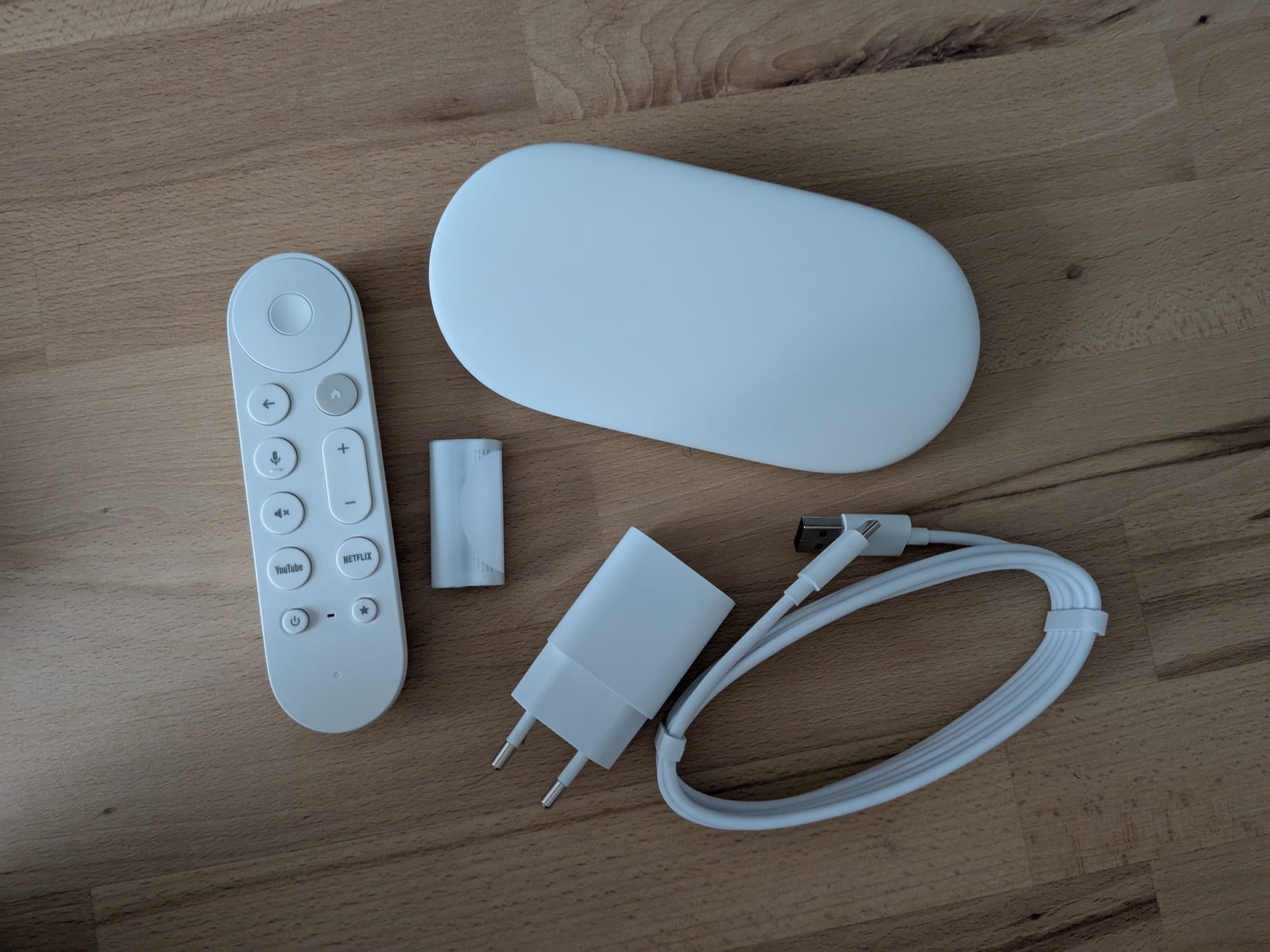 Beim Lieferumfang gibt es keine Überraschungen. Der TV Streamer kommt mit einem passenden Netzteil, einen USB-A- auf USB-C-Kabel und einer Fernbedienung samt zwei AAA-Batterien daher. Google hat sich somit gegen einen Akku in der Fernbedienung entschieden. Was ich im Lieferumfang vermisst habe, ist ein HDMI-Kabel. Falls du also kein HDMI-Kabel vorrätig hast, vergiss nicht noch eines dazu zu bestellen.
