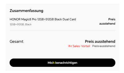 Gerüchten zufolge soll das neue Magic 8 Pro für rund 1300 Euro angeboten werden. Zur Auswahl steht in Deutschland lediglich das Modell mit 12 GB RAM und 512 GB Speicher sowie die Farbvariante Schwarz. Das preiswertere Magic 8 Lite soll etwa 460 Euro kosten. Beide Modelle sind inzwischen auf der Website von Honor Deutschland gelistet. Beim Lite-Modell spricht das chinesische Unternehmen von einer baldigen Verfügbarkeit, ohne jedoch den 15. Januar 2026 explizit zu nennen.