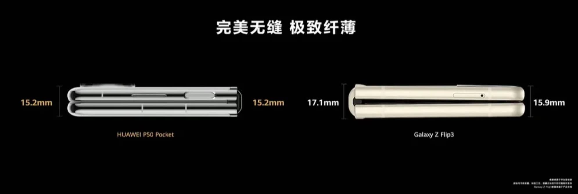 Das Gerät wiegt insgesamt 190 Gramm, was wesentlich leichter als die meisten Flaggschiff-Smartphones ist. Aufgeklappt hat es eine Dicke von 7,2 Millimeter, zugeklappt 15,2 Millimeter. Im Gegensatz zu Samsung hat es Huawei bei seinem Klapp-Handy geschafft, dass im zugeklappten Zustand keine Lücke zwischen den Bildschirmhälften entsteht. In der Theorie ist das natürlich ein Vorteil, da so weniger Schmutz zwischen die Bildschirme geraten kann, wenn man das P50 Pocket in der Tasche hat.
