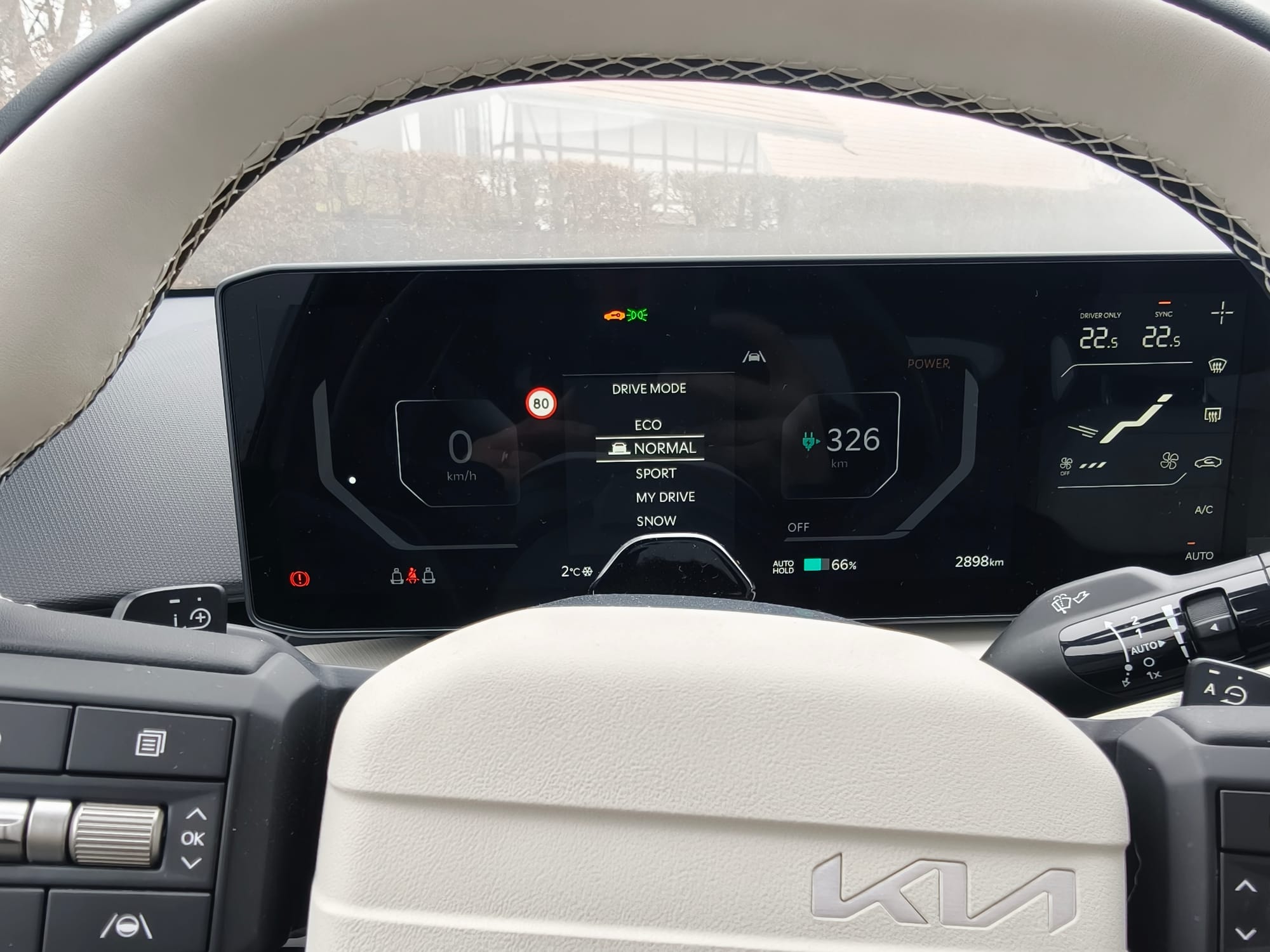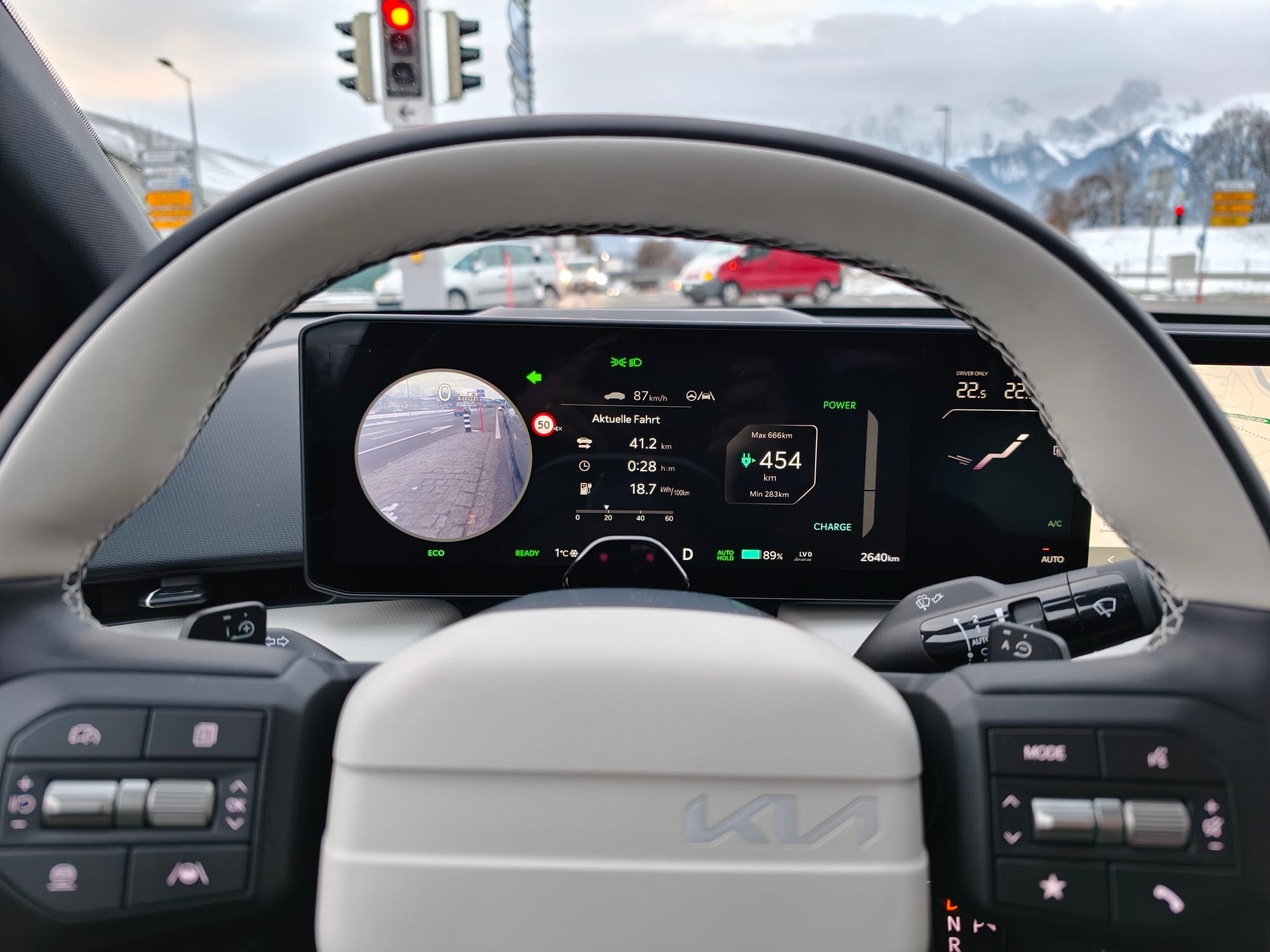 Im Stadtverkehr mit viel Anfahren und Abbremsen erhöhte sich der Verbrauch auf 21,5 kWh. Das ist nicht überraschend, da auch die Lüftung, Sitzheizung und Lenkradheizung auf Hochtouren liefen. Sobald der Verkehr flüssiger ist und das Auto nicht derart aufgewärmt werden muss, reduzieren sich die 21,5 kWh. Dann zeigte mir das Auto Werte zwischen 16 und 18 kWh an, was bei den Temperaturen um die 0 Grad in Ordnung ist.