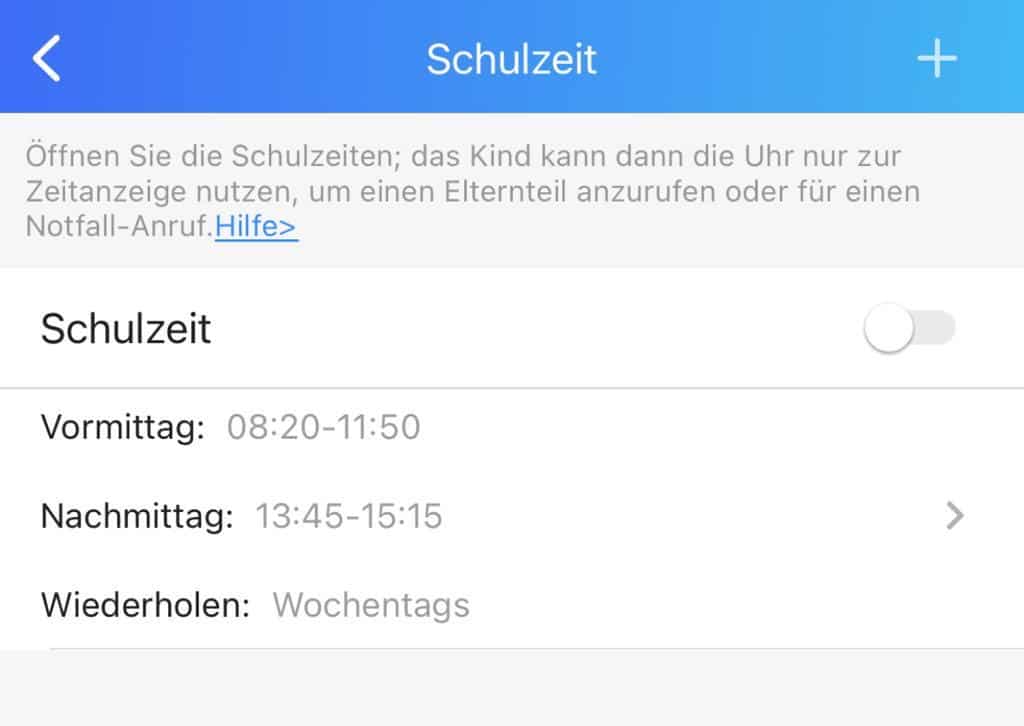 Für Schulkinder lässt sich die Nutzung der Smartwatch über die Funktion namens Schulzeit über die App einschränken. Es können zwei Blöcke pro Tag mit unterschiedlichen Zeiten (Start- und Endzeit) definiert werden, einen für den Vormittag und einen für den Nachmittag. Als Elternteil kann so ganz genau bestimmt werden, während welcher Zeit die Uhr genutzt werden darf.