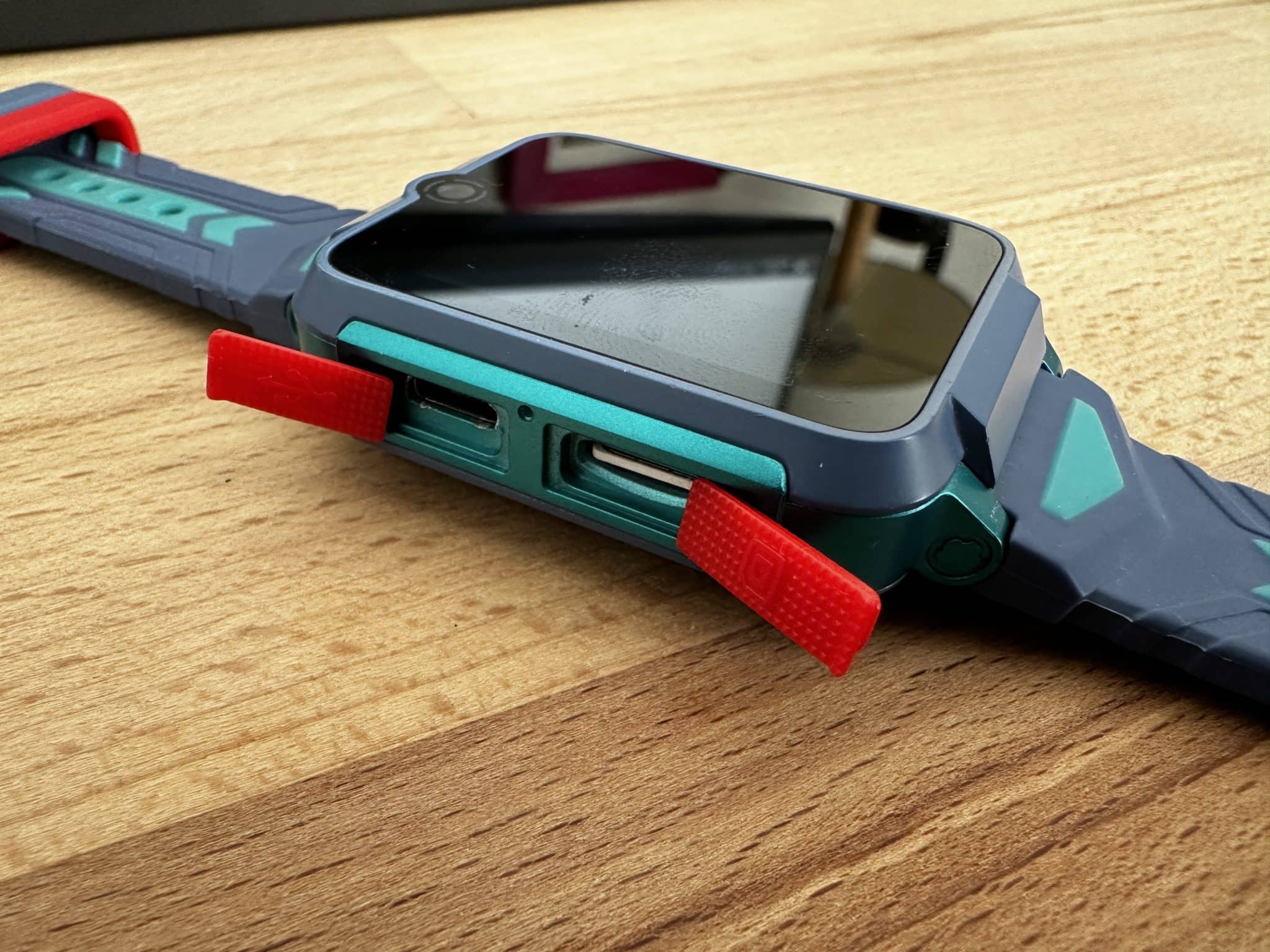 Die Movetime Family Watch MT42X verkauft TCL in der Schweiz in zwei Farbvarianten: Blau oder Pink. Meine Tochter hat sich für das blaue Modell entschieden. Nimmt man die Uhr erstmals in die Hand, fällt das Gewicht auf. Mit 55 Gramm ist sie kein Leichtgewicht. Nur so als Vergleich: Eine Apple Watch SE (40 mm, mit Mobilfunk) wiegt keine 30 Gramm.