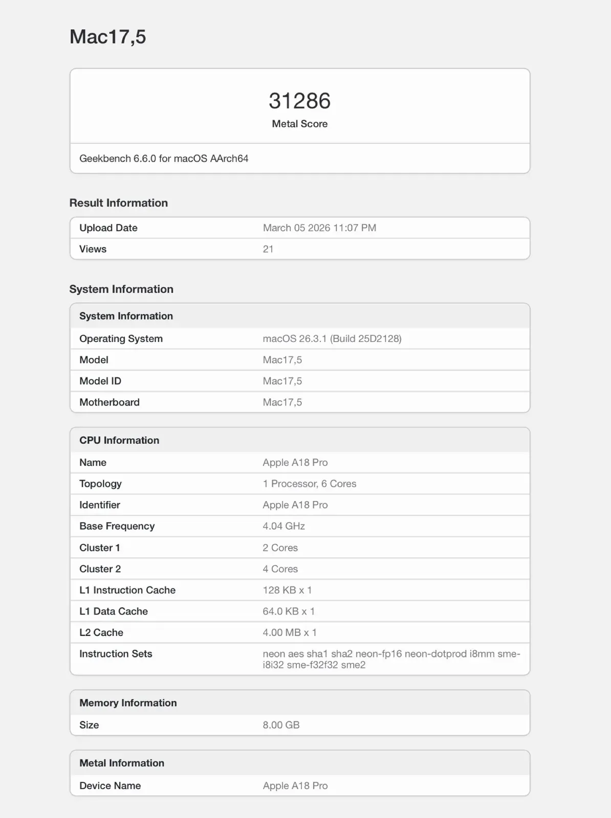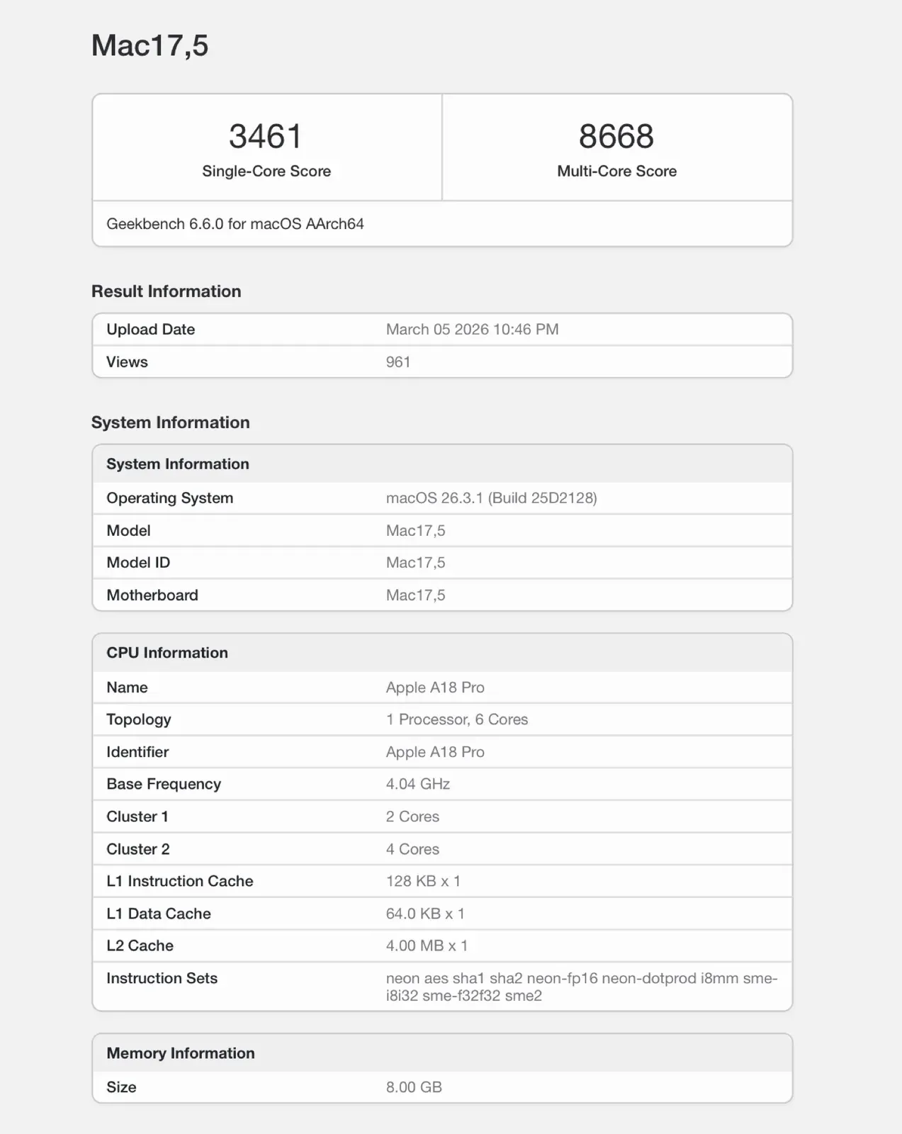 Doch was bedeutet das in Bezug auf die System- und Grafikleistung? Hinweise darauf liefern erste Benchmark-Tests. So wurde das MacBook Neo erstmals bei Geekbench getestet. Im CPU-Benchmark erreicht das Neo mit 3461 Punkten im Single-Core- und 8668 Punkten im Multi-Core-Test nahezu die gleiche Leistung wie das iPhone 16 Pro (Max). Damit ist das Billig-MacBook zwar leicht schneller als ein MacBook mit M1-Chip, gegen die aktuellen Modelle mit M4- oder M5-Chipsatz hat es jedoch keine Chance.