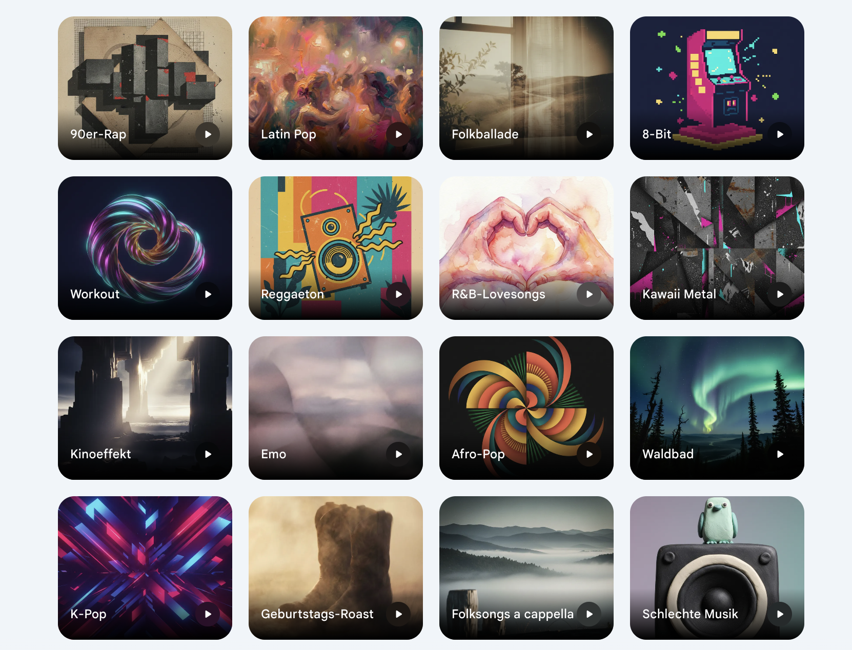 Seit heute hat Googles eigenes KI-Modell Gemini eine neue Funktion: Du kannst selbst Songs generieren. Zur Auswahl stehen dabei 16 verschiedene Genres, unter anderem KPop, 90s-Rap oder Latin Pop. Mit «Schlechte Musik» und «Birthday-Roast» hat es auch zwei eher humorvolle Kategorien.
