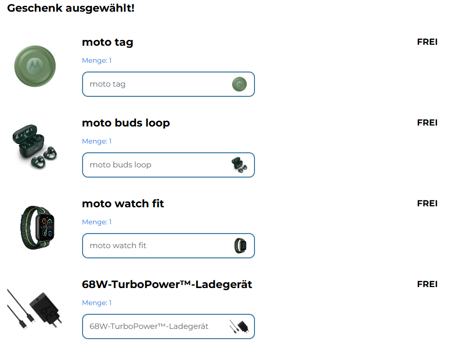 Und dieser Gutscheincode kann ab sofort direkt bei Motorola eingelöst werden. Damit bekommst du das neue knapp 6 Millimeter dünne Edge 70 für 529 statt 799 Franken. Somit gewährt Motorola bereits zum Start einen beachtlichen Rabatt von 270 Franken. Doch damit nicht genug. Ebenfalls können alle Vorbesteller folgendes Zubehör gratis abstauben und auf Wunsch einen 1-Jahres-Displaybruchschutz für 1 statt 41 Franken abschliessen: