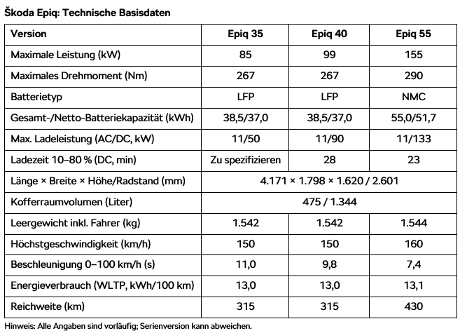 Der Skoda Epiq basiert, wie auch die kommenden Modelle von VW und Cupra, auf der MEB+-Plattform und wird in Spanien gefertigt. Zum Marktstart wird er in drei Varianten angeboten. Diese hat Skoda bereits im Vorfeld bekannt gegeben, ohne jedoch Preise zu nennen. Folgend eine Übersicht der geplanten Modellvarianten: