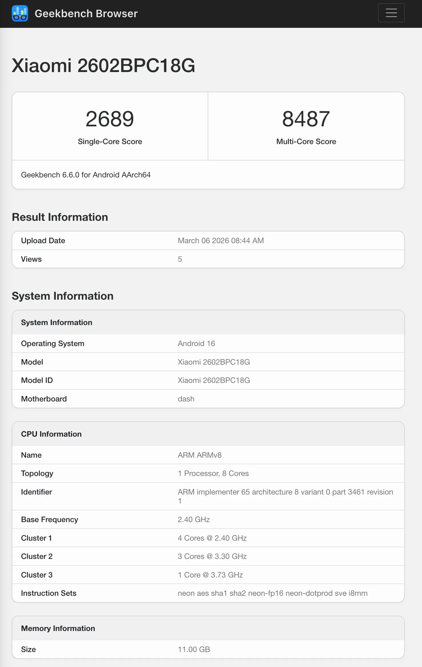 Inzwischen wurde das Poco X8 Pro Max mit der Modellbezeichnung 2602BPC18G auch in ersten Benchmarks gesichtet. Das getestete Modell verfügt über 12 GB Arbeitsspeicher, was einem früheren Leak zufolge auch der Realität entspricht. Angeblich plant Poco kein Modell mit mehr Arbeitsspeicher. Beim internen Speicher soll es hingegen die Wahl zwischen 256 und 512 GB geben.