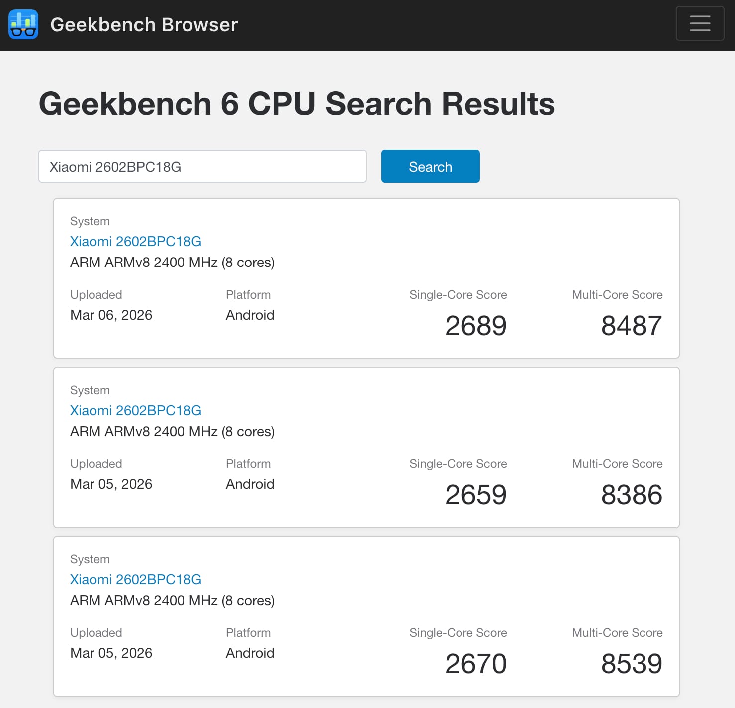 Im Geekbench erzielte das Poco X8 Pro Max keine besonders guten Ergebnisse, insbesondere im Multi-Core-Test nicht. Mit einem Multi-Core-Score von 8471 liegt es deutlich hinter Smartphones mit Snapdragon 8 Gen 5 oder Dimensity 9500 wie dem Oppo Find X9 Pro. Der Unterschied im Single-Core-Score fällt geringer aus. Dort erreicht das Pro Max durchschnittliche 2673 Punkte. Damit ist es nur geringfügig langsamer als Smartphones mit Snapdragon 8 Elite Gen 5.