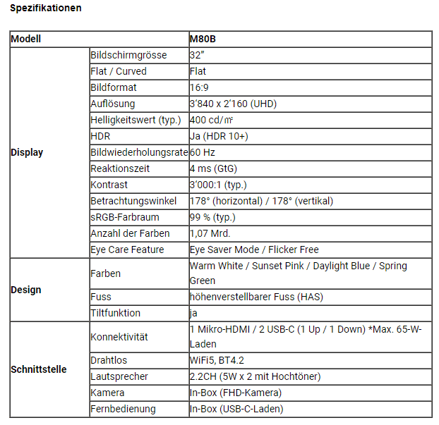 Die Spezifikationen zum Samsung Smart Monitor M8