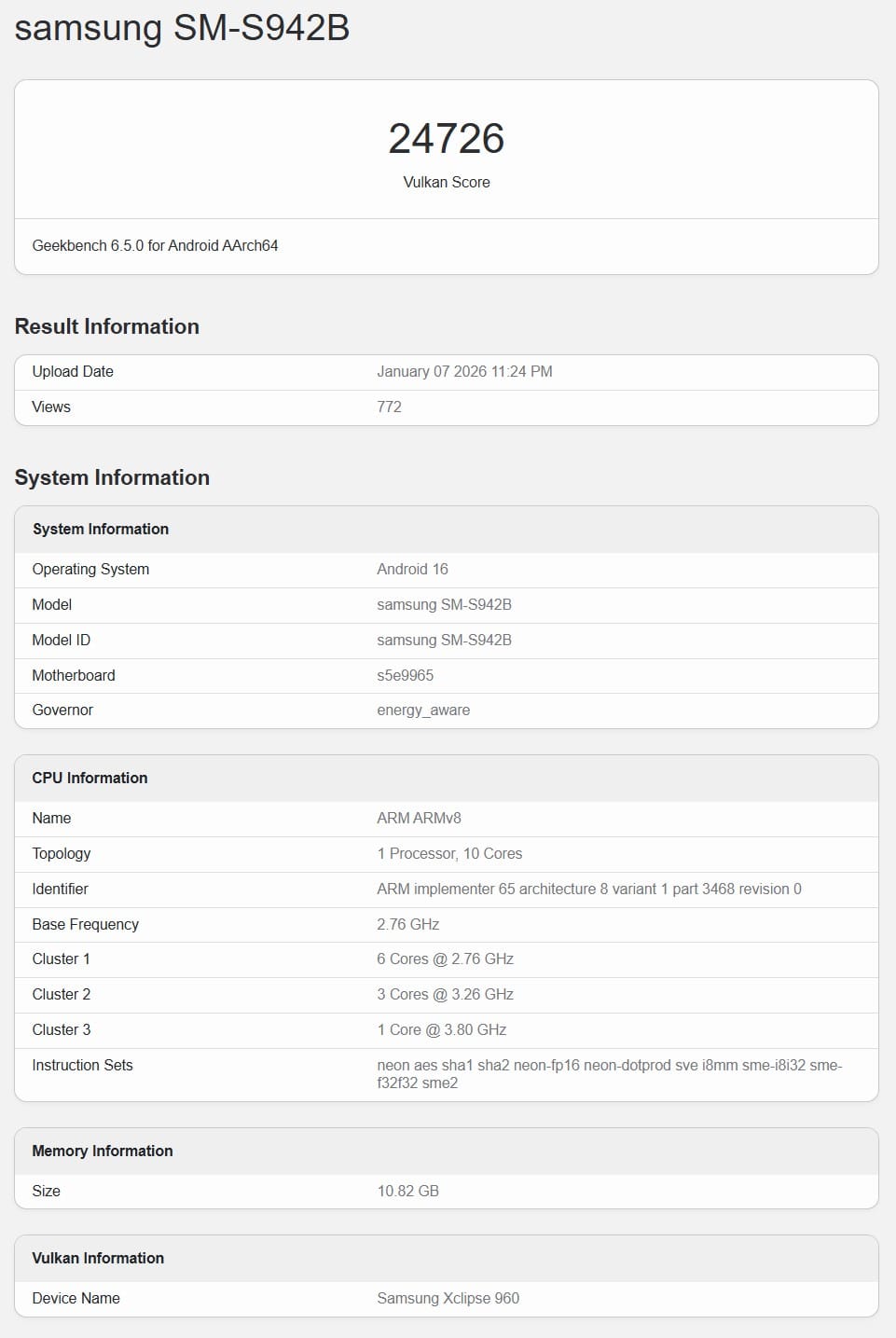 Die grosse Frage ist, ob der Exynos 2600 dieses Mal mit dem Snapdragon 8 Elite Gen 5 mithalten kann. Bereits im Vorfeld zeigte sich der Chipsatz in Benchmark-Tests von seiner guten Seite. Bei Geekbench gibt es jetzt einen weiteren Eintrag mit der Modellnummer SM-942B. Gerüchten zufolge trägt das Galaxy S26, das auch für den internationalen Markt bestimmt ist, diese Modellnummer. Das wiederum könnte ein Hinweis darauf sein, dass Samsung zumindest das Basismodell auch ausserhalb Südkoreas mit dem Exynos 2600 ausstatten wird.