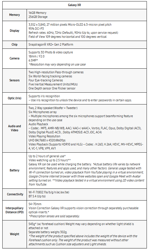 Im Galaxy XR kommt der speziell für XR-Anwendungen optimierte Snapdragon XR2+ Gen 2 Chip von Qualcomm zum Einsatz. Samsung hat zwei 4K-Micro-OLED-Displays mit einer gestochen scharfen Auflösung von 3552 x 3840 Pixeln integriert. Die Bildwiederholrate beträgt bis zu 90 Hertz und kann im Bereich zwischen 60 und 90 Hertz automatisch variieren. Das XR-Headset unterstützt 8K-Videowiedergabe und zahlreiche Audio- und Video-Codecs.