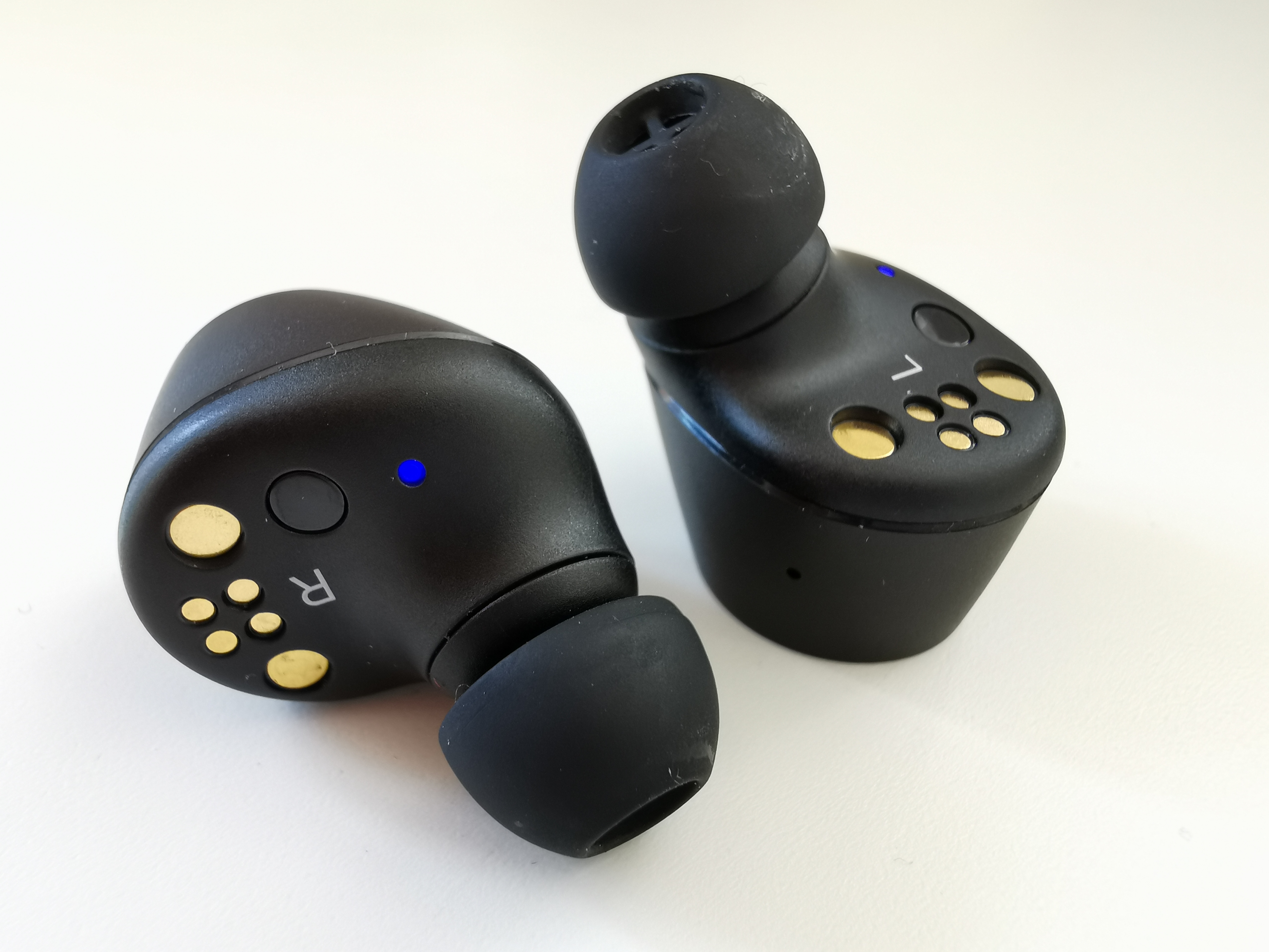 Gefallen tut mir dafür wiederum, dass ich eine LED-Anzeige für den Verbindungsstatus auf jedem Kopfhörer habe. Ich kann hier also gleich am Kopfhörer ablesen, ob meine Kopfhörer verbunden sind oder nicht. Alternativ sieht man sogar, ob sich die Kopfhörer im Pairing-Modus befinden. Das ist allerdings gar nicht nötig, denn fürs Pairing hat man diese sowieso im Ohr und hört dann eine Stimme, die mit einem redet – auch ein sehr nettes Feature.