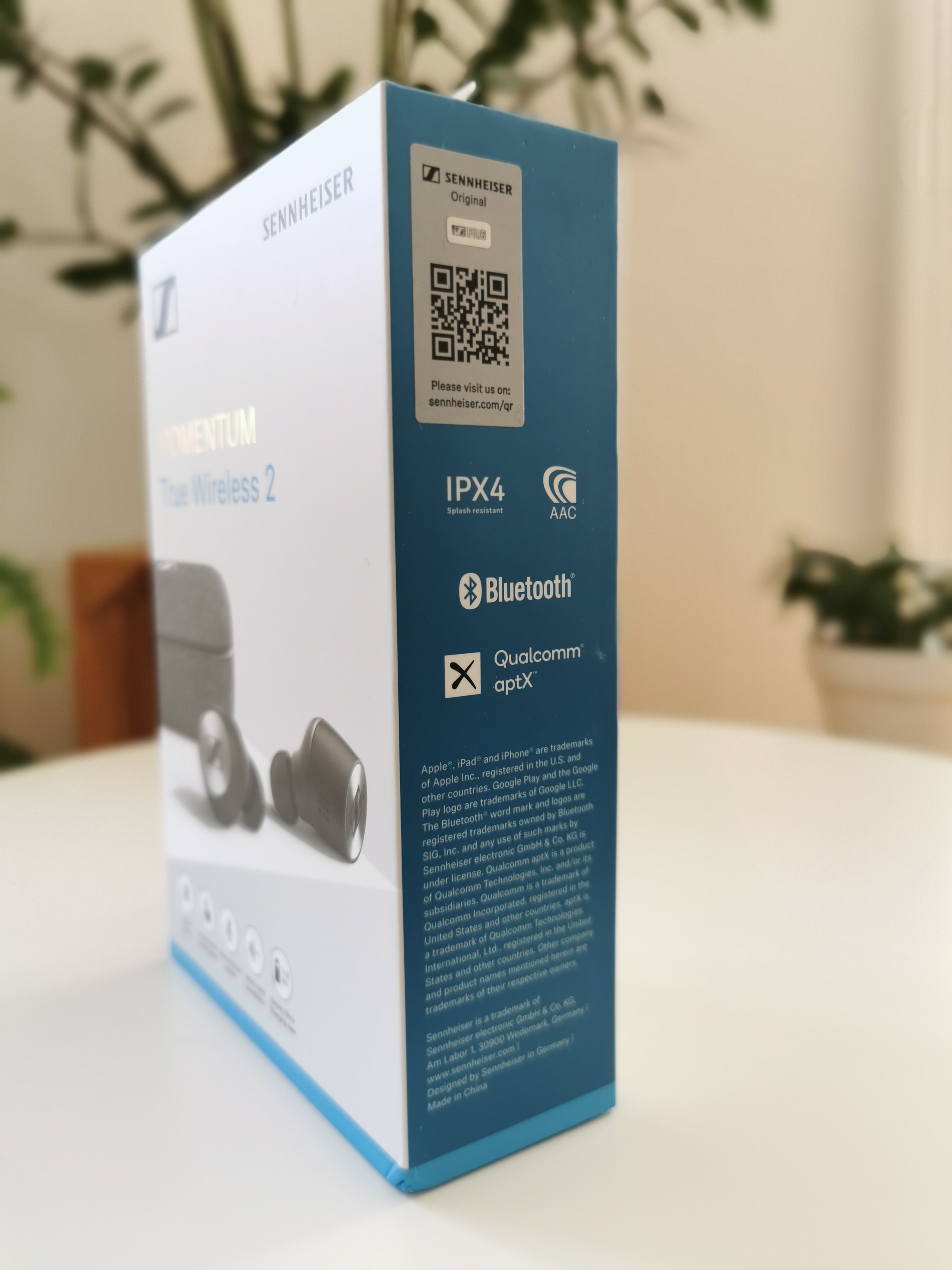 Von aussen sieht die Verpackung der Momentum True Wireless 2 nicht speziell nach Premium aus. Dennoch gefällt mir der Karton, vor allem die Druckveredelung mit Heisluftfolienprägung des Modellnamens. Ebenfalls gefiel mir der seitliche Rand, der mit einer türkisfarbenen Folie veredelt war. Sehr hübsch.