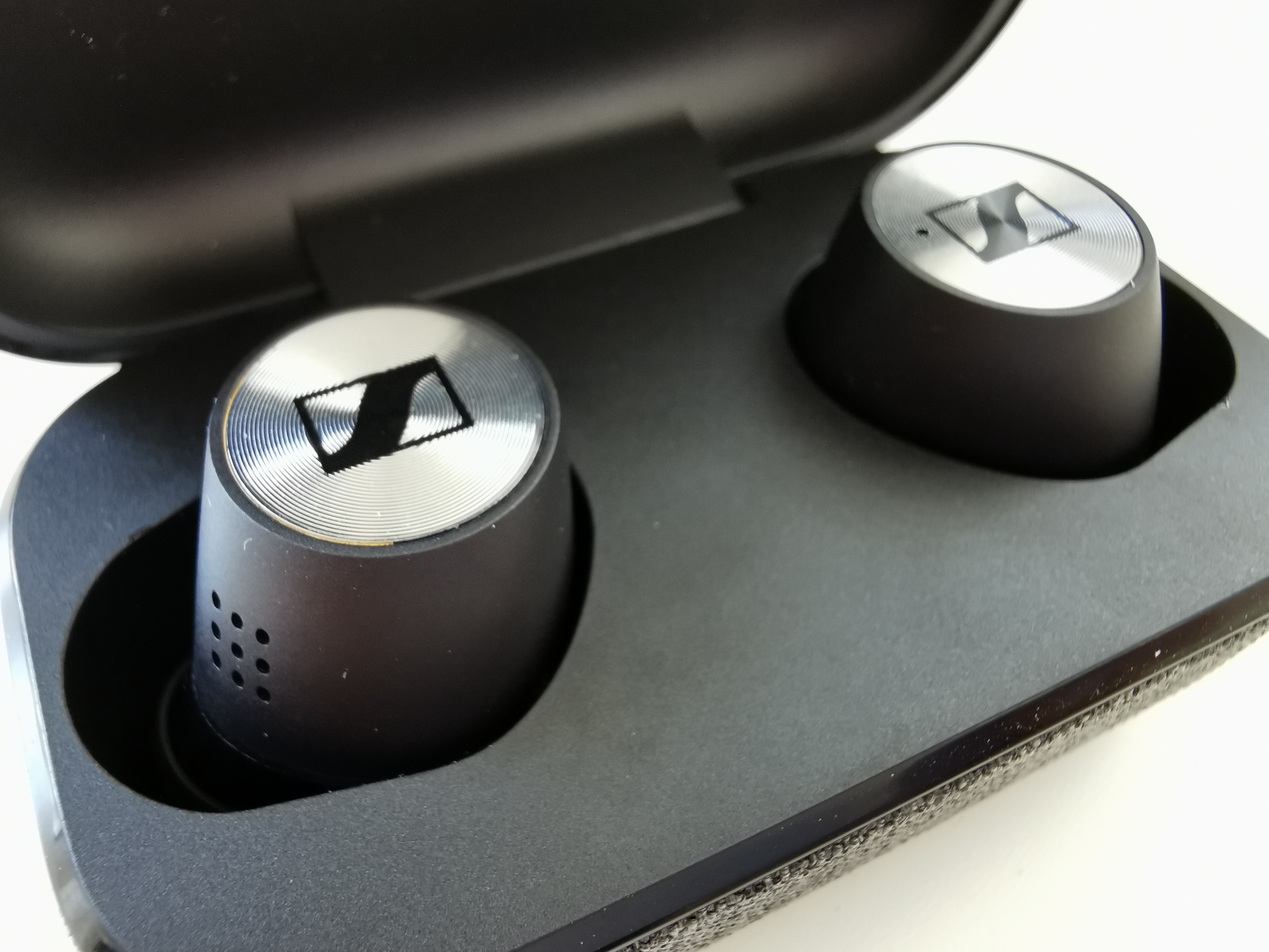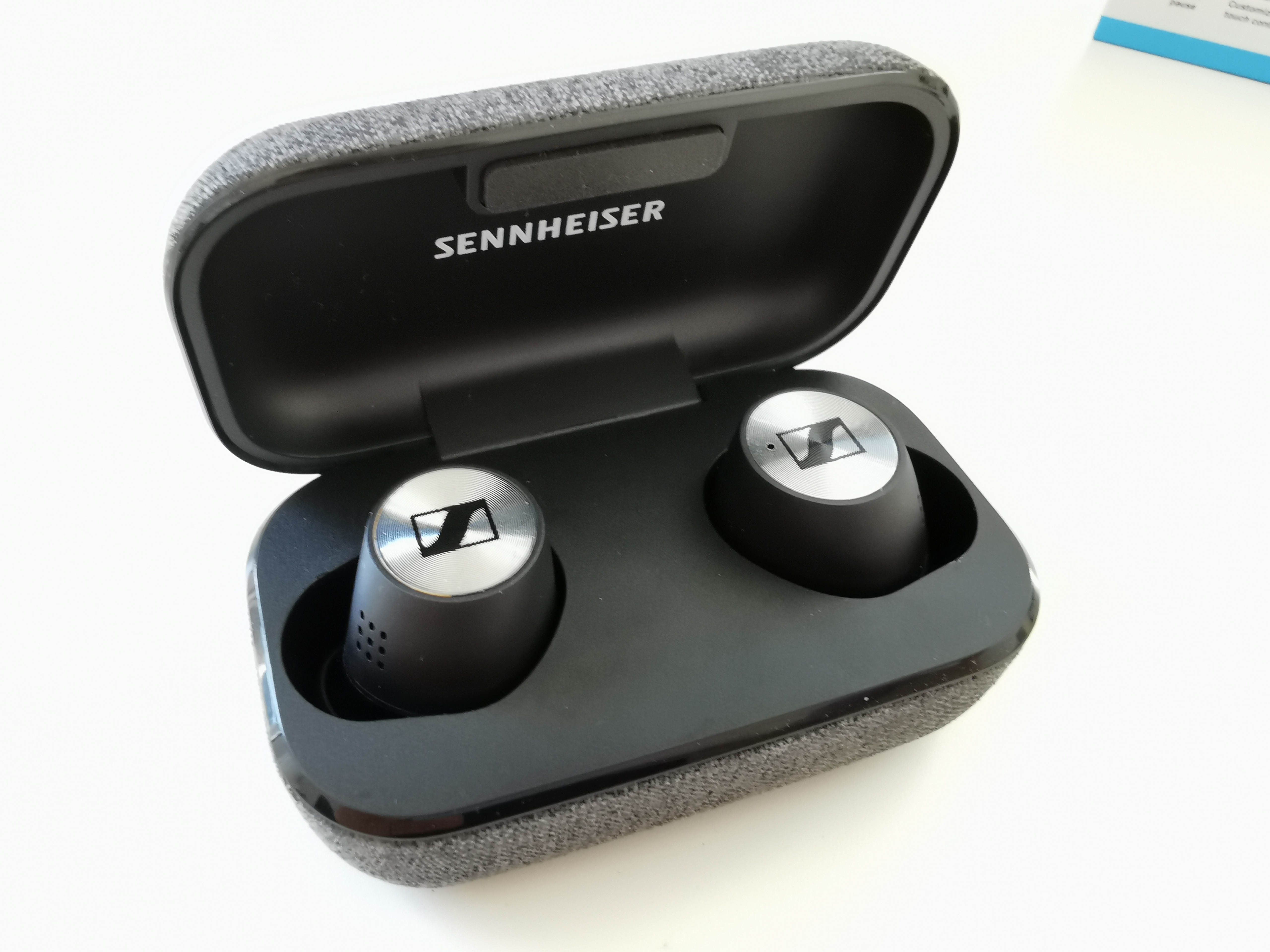 Wie bei In-Ear-Kopfhörern üblich kommen die Momentum True Wireless 2 in einem Case daher. Dieses ist fast komplett mit einem gräulichen Stoff überzogen, was ihnen eine edle Optik und auch Haptik verleiht. Mir hat das besonders gefallen, weil sie so fast perfekt zu meinen Bowers & Wilkins PX7 passen.