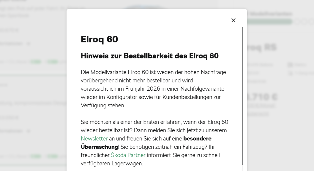 Mit der Basisversion sind die beiden preiswerten Modelle Elroq 50 und Elroq 60 gemeint. Zudem scheint der Bestellstopp bisher (noch) nicht für die Schweiz zu gelten. Zumindest der Elroq 60 kann auch weiterhin über den Konfigurator bestellt werden. Wer den Konfigurator in Deutschland öffnet und den Elroq 60 bestellten möchte, erhält allerdings die folgende Nachricht:
