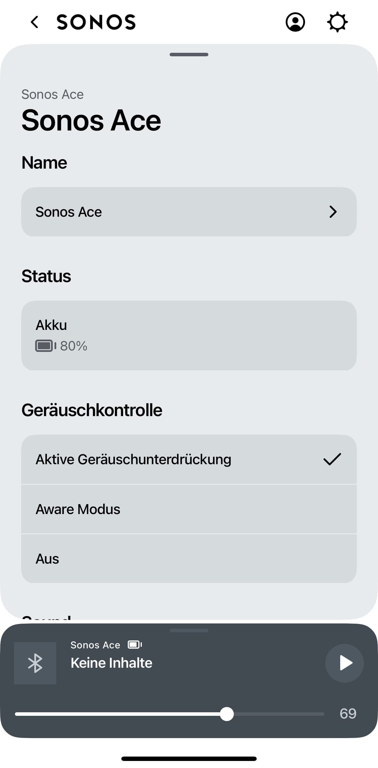 Die Sonos Ace wollen nicht nur mit einer hervorragenden Soundqualität überzeugen, sondern auch mit einem mindestens so guten Noise Cancelling und Transparenzmodus (Aware-Mode). Beide haben mich überrascht - positiv versteht sich. Fangen wir mit der aktiven Geräuschunterdrückung an.