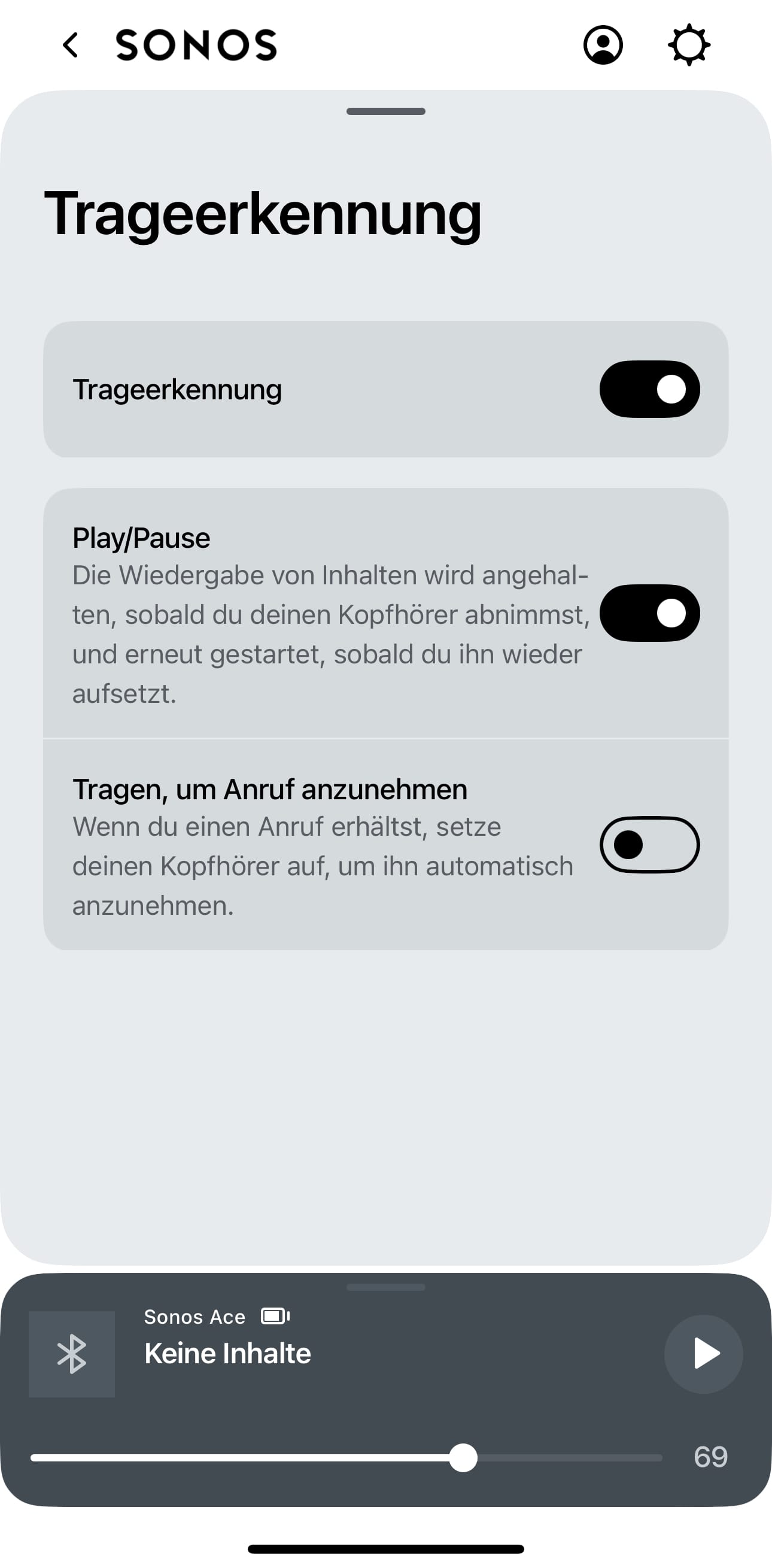 Der Sonos Ace unterstützt eine automatische Trageerkennung, die sich in den Einstellungen auf Wunsch auch deaktivieren lässt. Nimmt man Kopfhörer ab, pausiert die Wiedergabe. Setzt man ihn wieder auf, spielt die Musik weiter. Diese Funktion war im Test hin und wieder unzuverlässig, so dass die Musik beim Absetzen weiter wiedergegeben wurde.